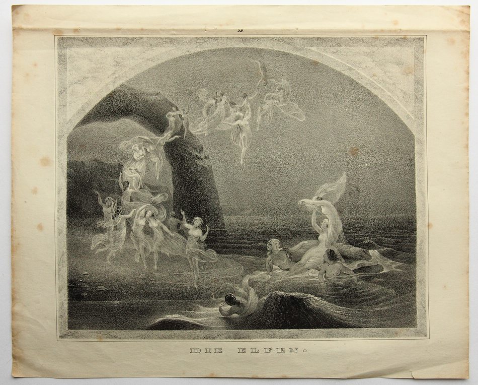- Description: On a seashore with striking rock formations, a few elves meet at night time for a merry dance. The female figures, covered only by thin cloth veils, move in an erotic dance over the water.