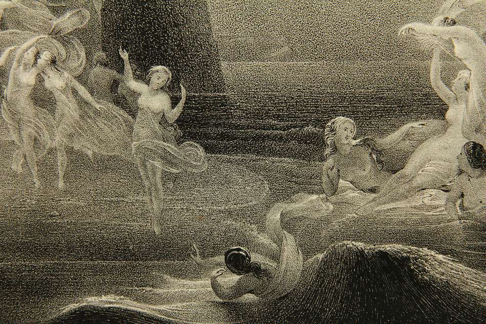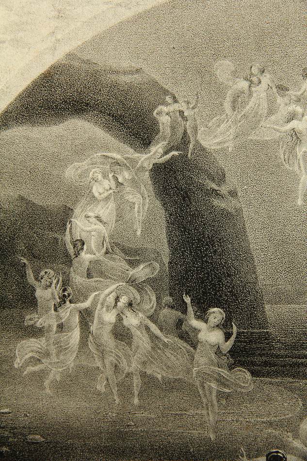 - Beschreibung: An einer Meeresküste mit markanten Felsformationen treffen sich zu nächtlicher Stunde einige Elfen zum vergnügten Tanz. Die weiblichen Gestalten, nur von dünnen Stoffschleiern bedeckt, bewegen sich in erotischem Tanz über dem Wasser.