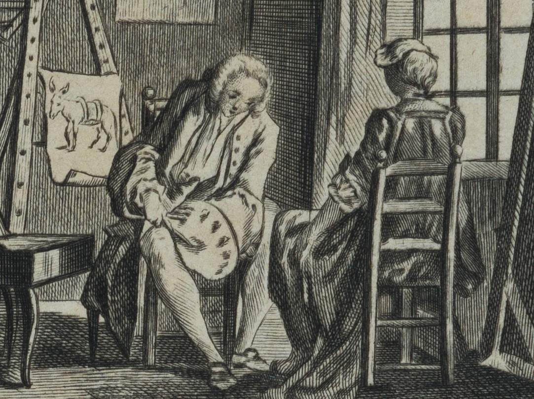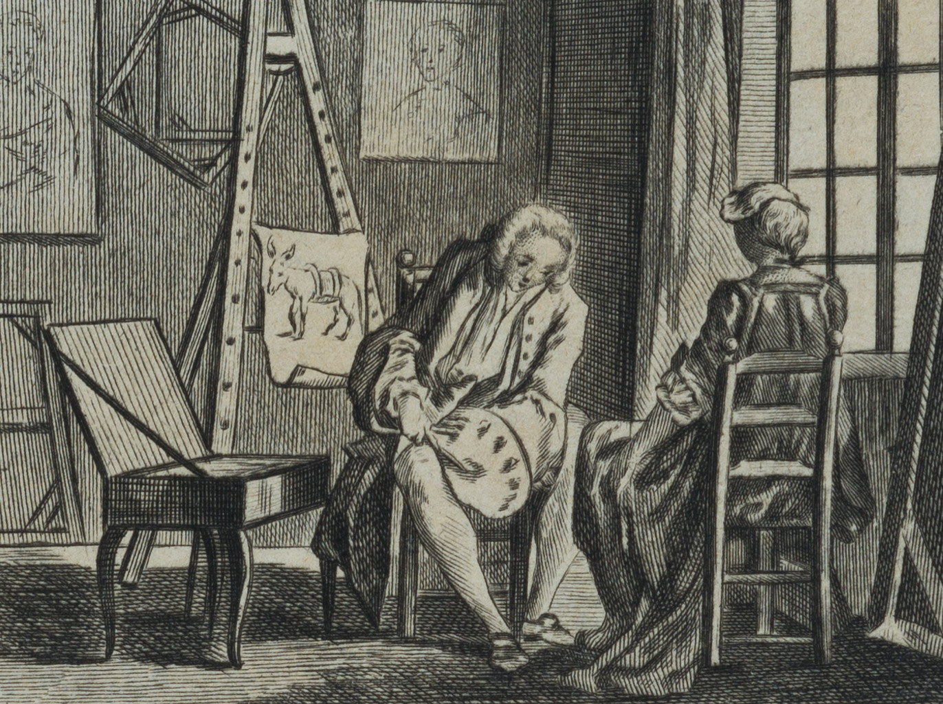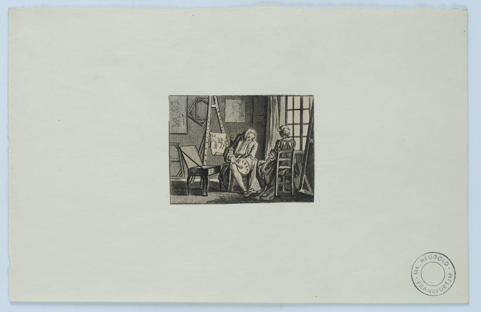 - Beschreibung: Dem Maler sitzt eine Dame Modell, auf der Staffelei hängt jedoch das Bild eines Esels.