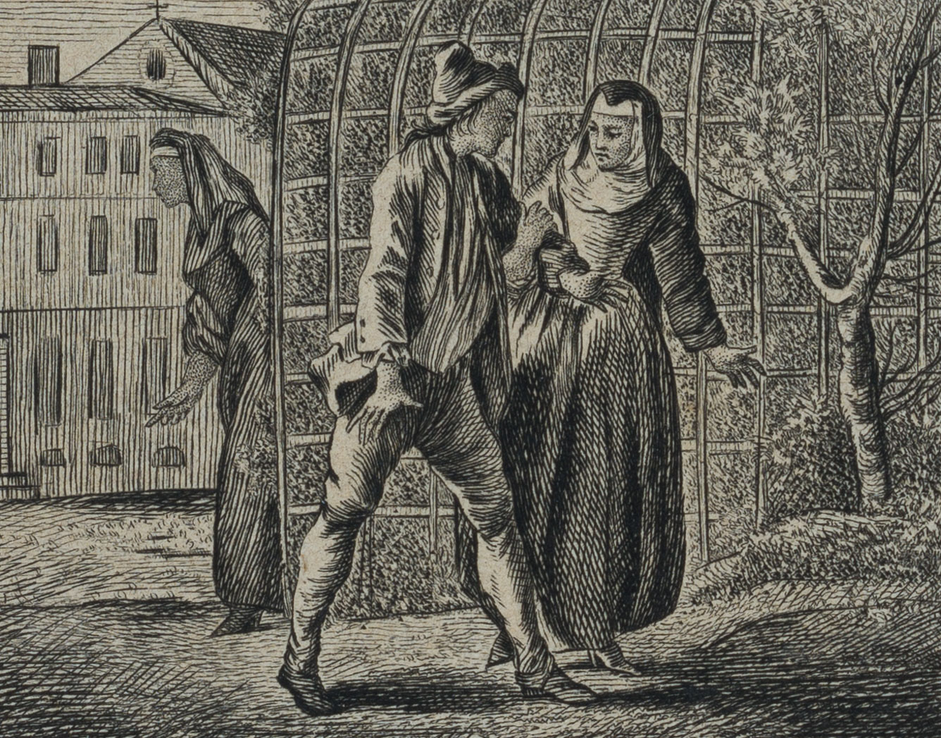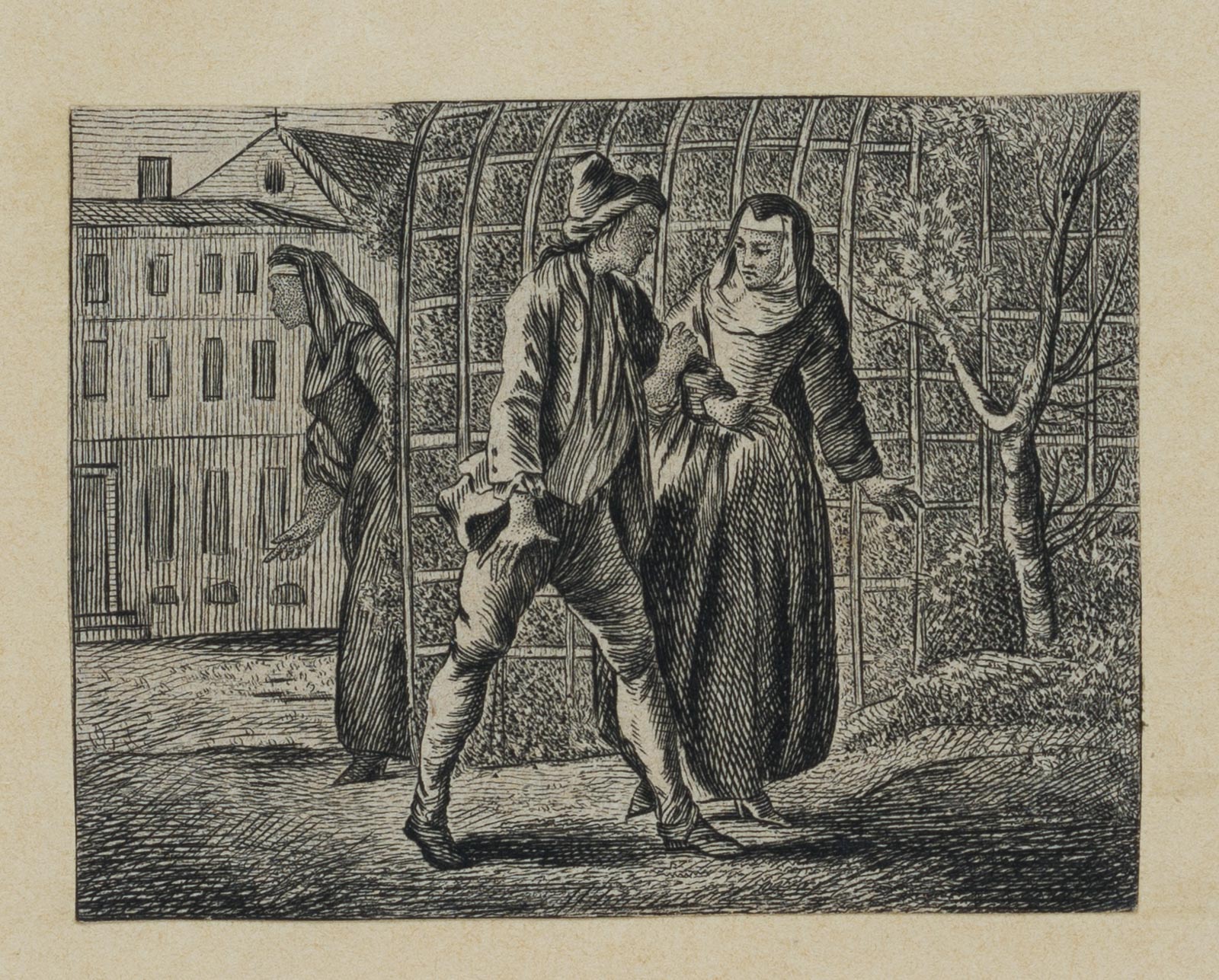- Description: A nun is holding a young boy by the arm. It seems as if she wants to hide with him from the passing person in the background. Each with collector’s stamp at lower right: Maximilian Karl Neudold. Please note our other offers.