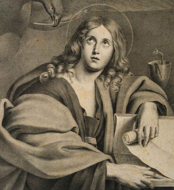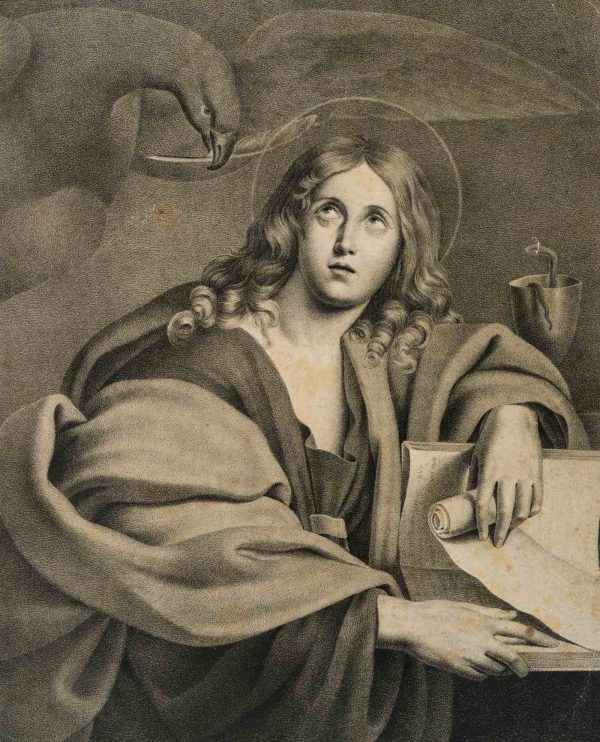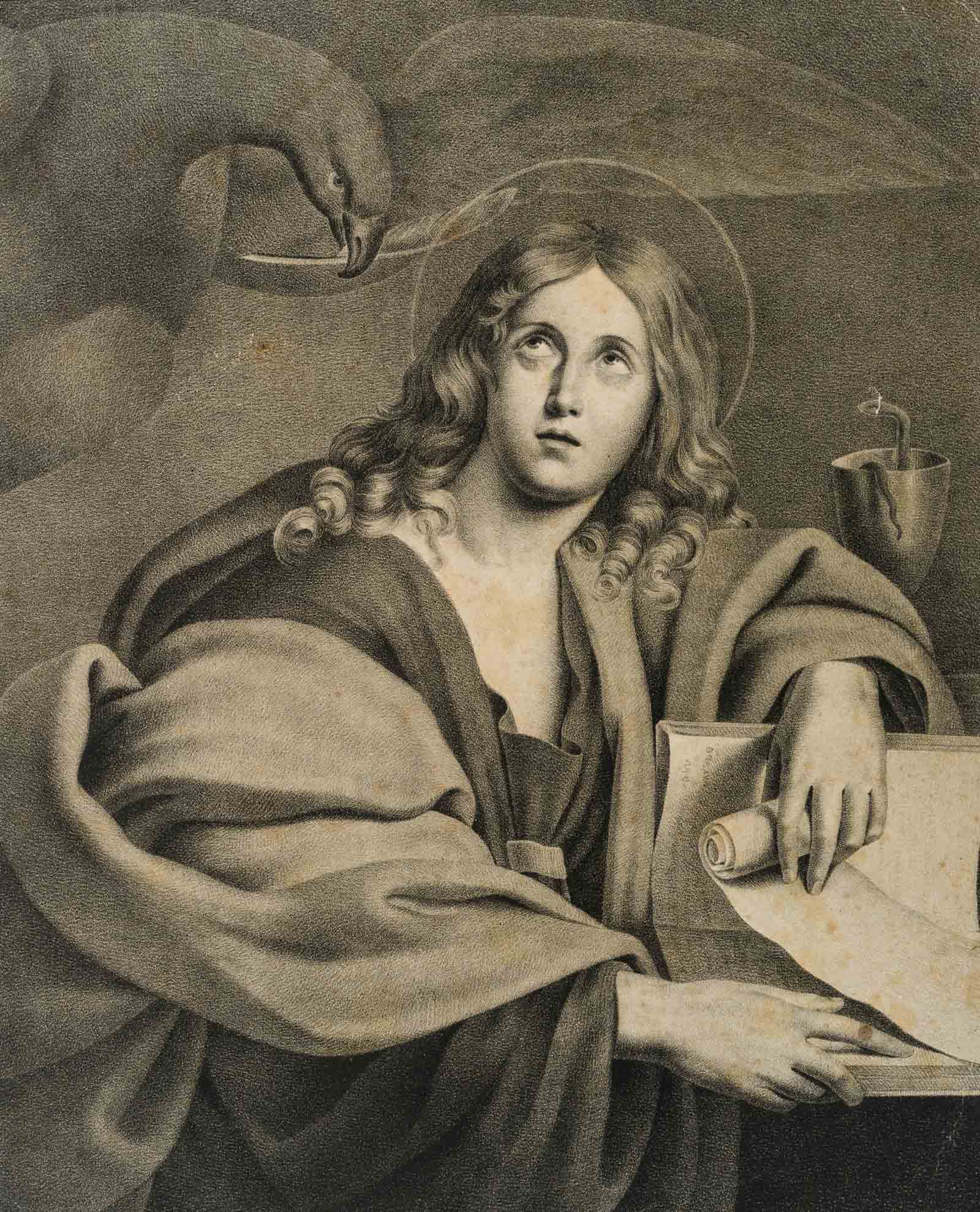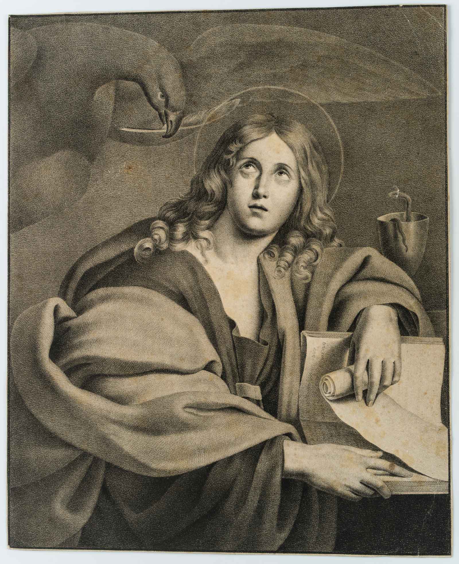- Description: John the Evangelist sits in front of his book and looks over his shoulder at an eagle, the attribute of the Evangelist. In the background is a chalice from which a snake escapes. This background scene leads back to the stories of the Legenda Aurea, in which the high priest Aristodemus tries to poison John with a chalice, 19th century, lithograph.