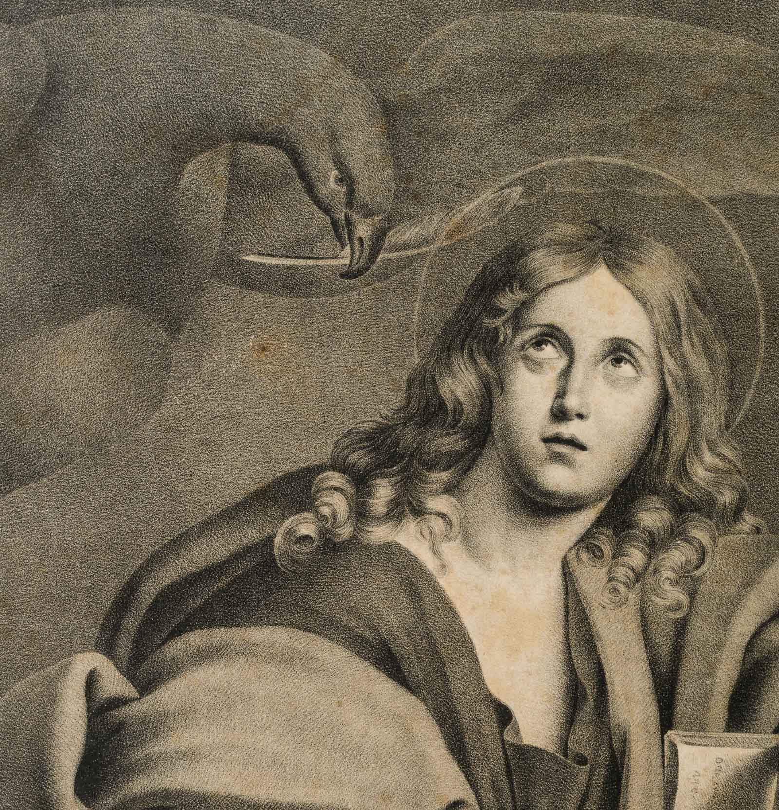 - Beschreibung: Der Evangelist Johannes sitzt vor seinem Buch und schaut über seine Schulter zu einem Adler, das Attribut des Evangelisten. Im Hintergrund steht ein Kelch aus dem eine Schlange entweicht. Diese Hintergrundszene führt zurück auf die Erzählungen der Legenda Aurea, in der der Oberpriester Aristodemus versucht Johannes mit einem Kelch zu vergiften, 19. Jh., Lithographie