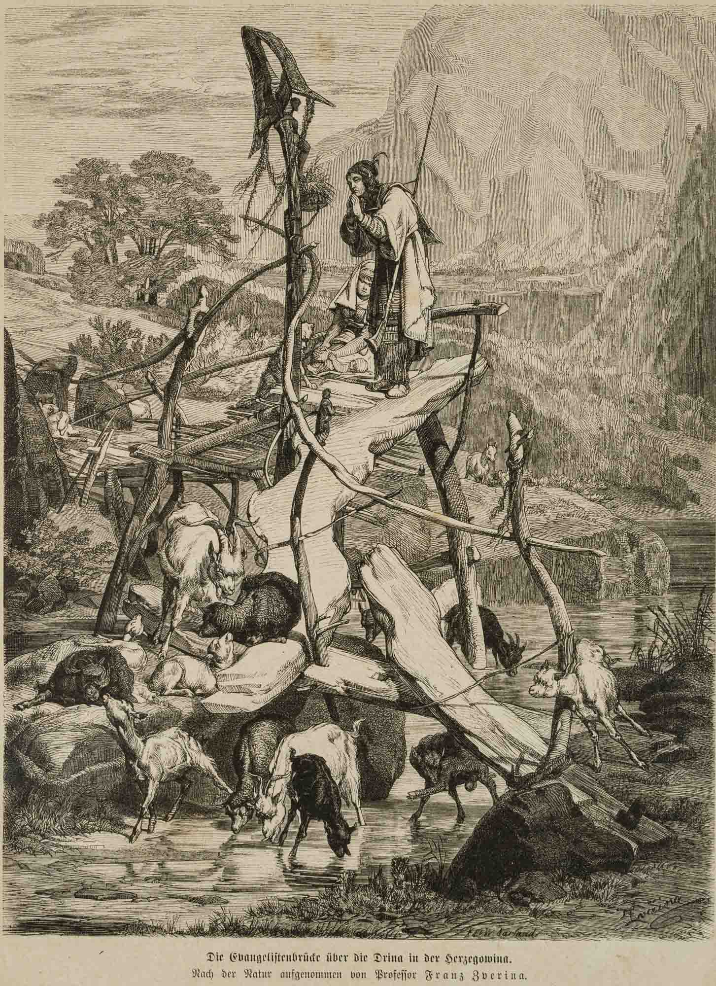 • Inscription: Titled and inscribed below the image “Die Evangelistenbrücke über die Drina in der Herzegowina. / Nach der Natur aufgenommen von Prof. Fanz Zverina.”.