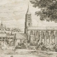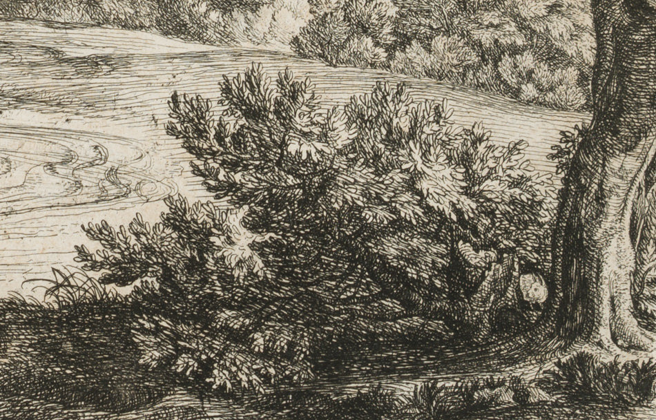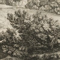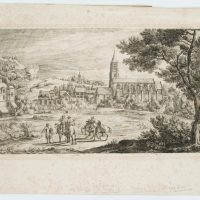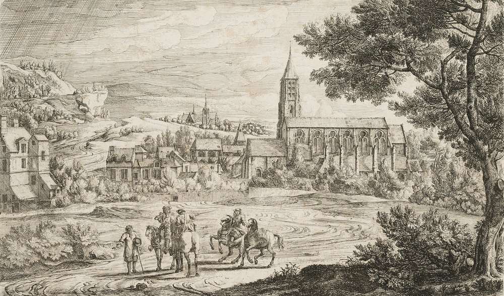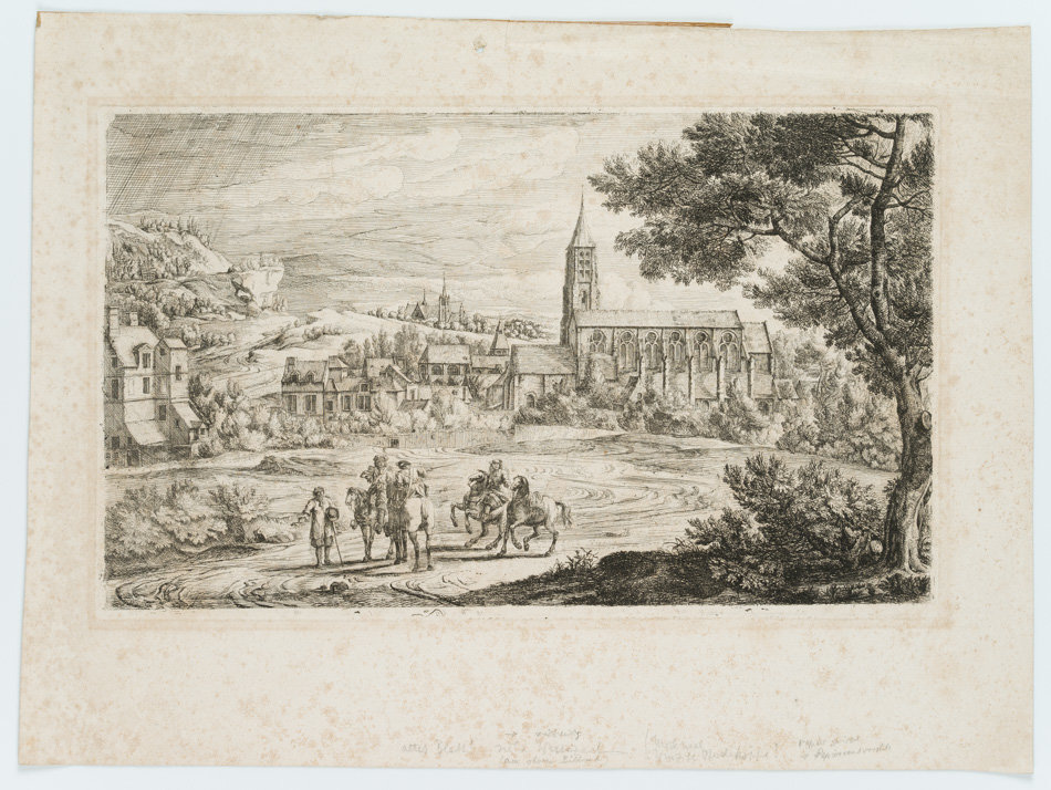 Before the gates of a small village with a large early Gothic church, three mounted soldiers meet and discuss with each other. Sitting on the backs of their powerful horses, two of the riders, who look like officers, are in lively conversation with each other, one gesticulating wildly with his riding crop. A third rider is leading another horse by the reins, struggling to calm the animals, startled by the sudden movement of the cavalryman in front of them. A fourth person, plainly dressed rather like a citizen of the nearby village, stands beside the scene, seemingly laboriously trying to convey a point of view.Almost like the scene of a recently broken encampment, the field in front of the village lies there with deep ruts in the ground. The church, which is disproportionately large for the cluster of houses, with large early Gothic traceried windows, flying buttresses and a single steeple, as well as the single-towered church in the neighbouring village, can be placed in the style of the early Gothic period in the region of Normandy or the greater Paris area.Perhaps the etching, drawn with elaborate, moving lines, shows the foreshadowing of an armed conflict in the near vicinity, to the course of which the lords on horseback are still exchanging their strategies and views.