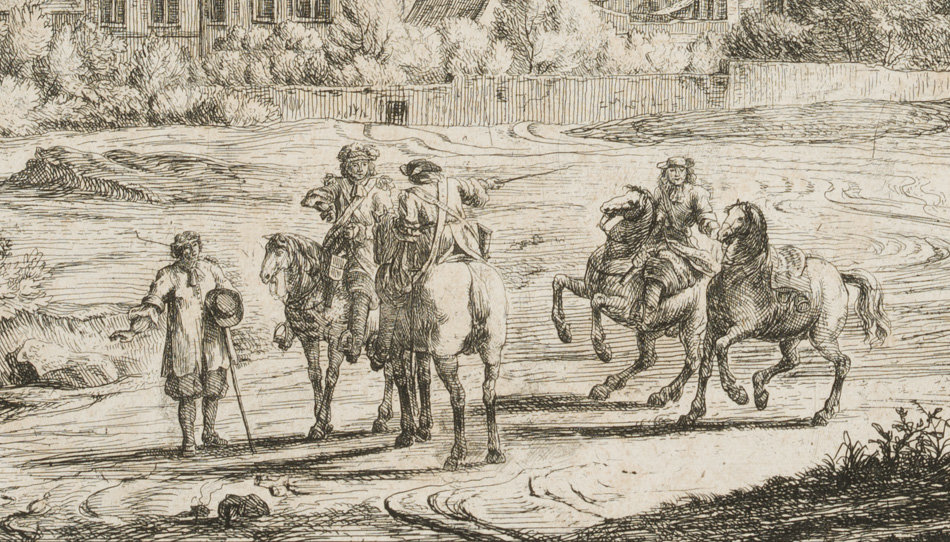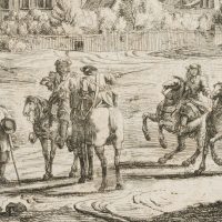 - Beschreibung: Vor den Toren einer kleinen Ortschaft mit einer großen frühgotischen Kirche treffen drei berittene Soldaten aufeinander und diskutieren miteinander. Auf dem Rücken ihrer kräftigen Pferde sitzend sind zwei der nach Offizieren aussehenden Reiter im lebhaften Gespräch miteinander, wobei der eine wild mit seiner Reitgerte gestikuliert. Ein dritter Reiter führt ein weiteres Pferd am Zügel und bemüht sich die Tiere, aufgeschreckt durch die plötzliche Bewegung des Kavalleristen vor ihnen, zu beruhigen. Eine vierte Person, schlicht und eher wie ein Bürger der nahen Ortschaft gekleidet, steht neben der Szene und versucht scheinbar mühevoll einen Standpunkt zu übermitteln.Beinahe wie der Schauplatz eines erst kürzlich aufgebrochenen Feldlagers liegt das Feld vor dem Ort mit tiefen Fahrspuren im Boden da. Die für die Häuseransammlung unverhältnismäßig große Kirche mit großen frühgotischen Maßwerkfenstern, Strebebögen und einem einzelnen Kirchturm sowie die eintürmige Kirche im Nachbarort lassen sich in die Stilepoche der Frühgotik in der Region der Normandie oder dem Großraum um Paris einordnen.Vielleicht zeigt die Radierung, die mit kunstvollen, beweglichen Linien gezeichnet ist, die Vorahnung eines bewaffneten Konfliktes in der näheren Umgebung, zu dessen Ablauf die Herrschaften zu Pferd noch ihre Strategien und Ansichten austauschen.