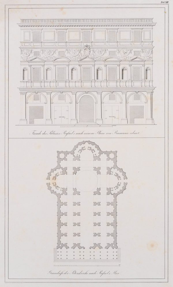 - Beschreibung: Ansicht der Fassade des Palastes im Borgo, genannt Palazzo Caprini, Haus Raffaels bzw. Casa di Raffaello. Darunter Grundrissplan des Petersdomes nach dem Entwurf Raffaels.