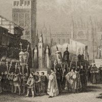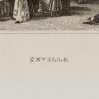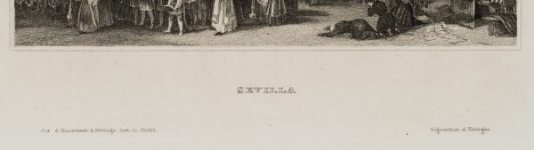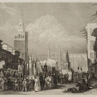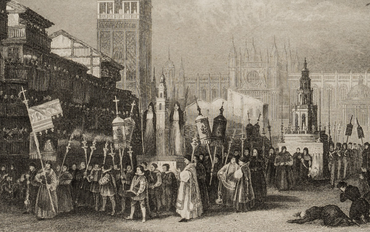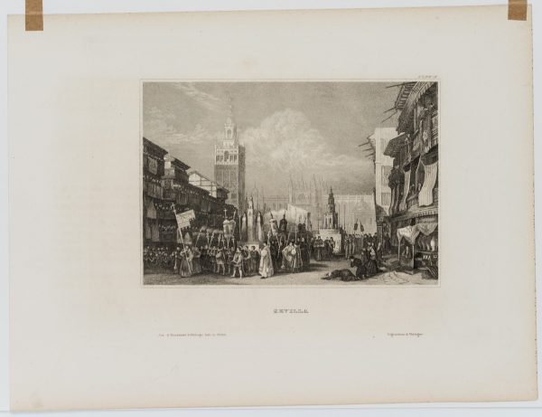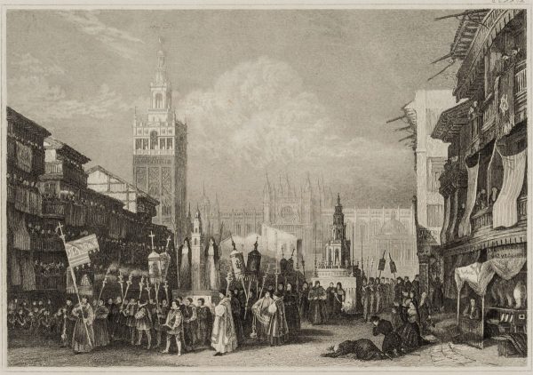 Unknown (19th century), Solemn procession in Seville with view of the cathedral, c. 1850, Steel engraving