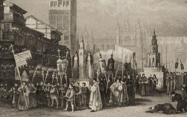 • Description: View through the streets of Seville to the impressive Gothic cathedral. In the foreground, a religious procession with ceremonial floats is taking place.