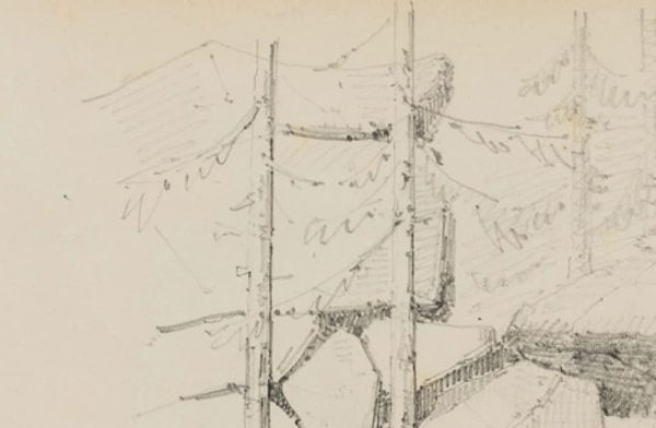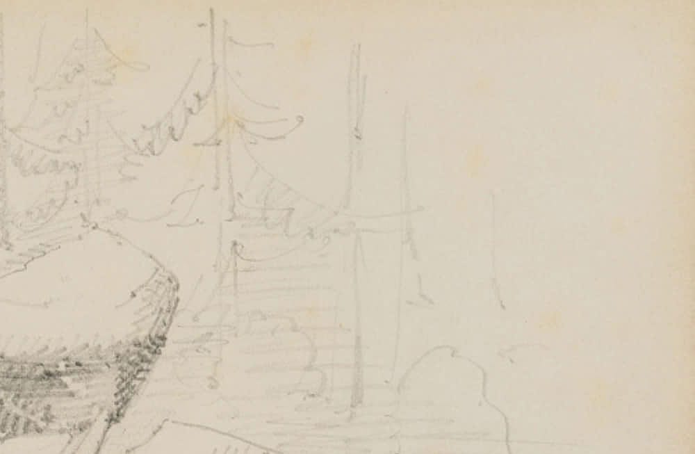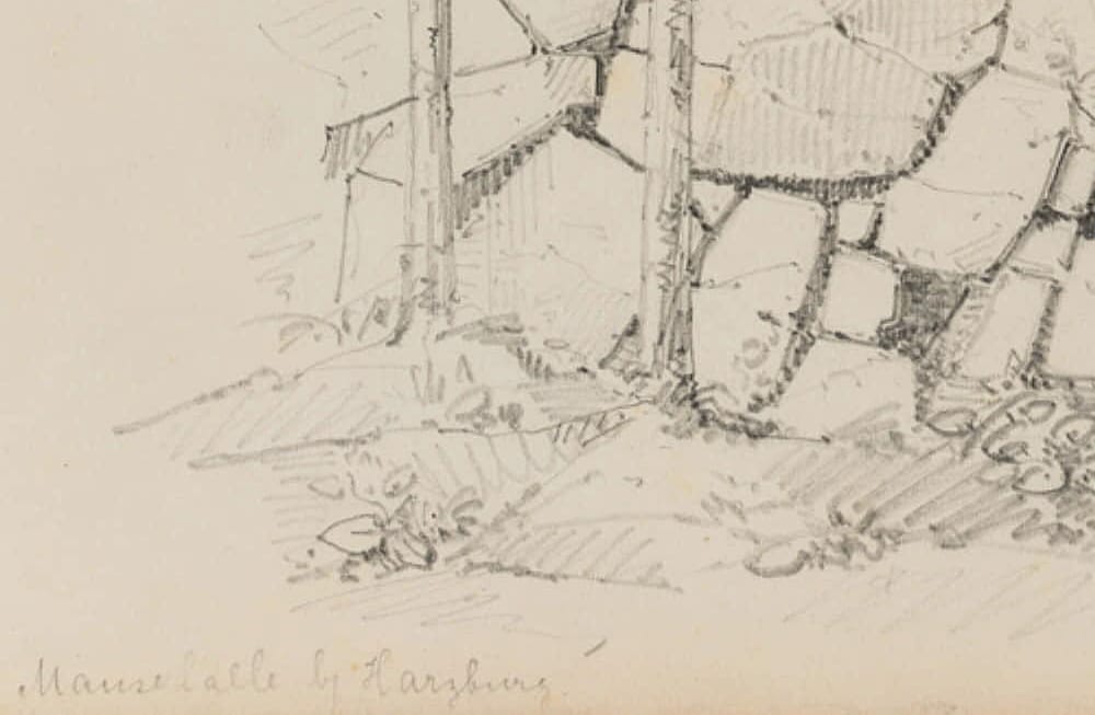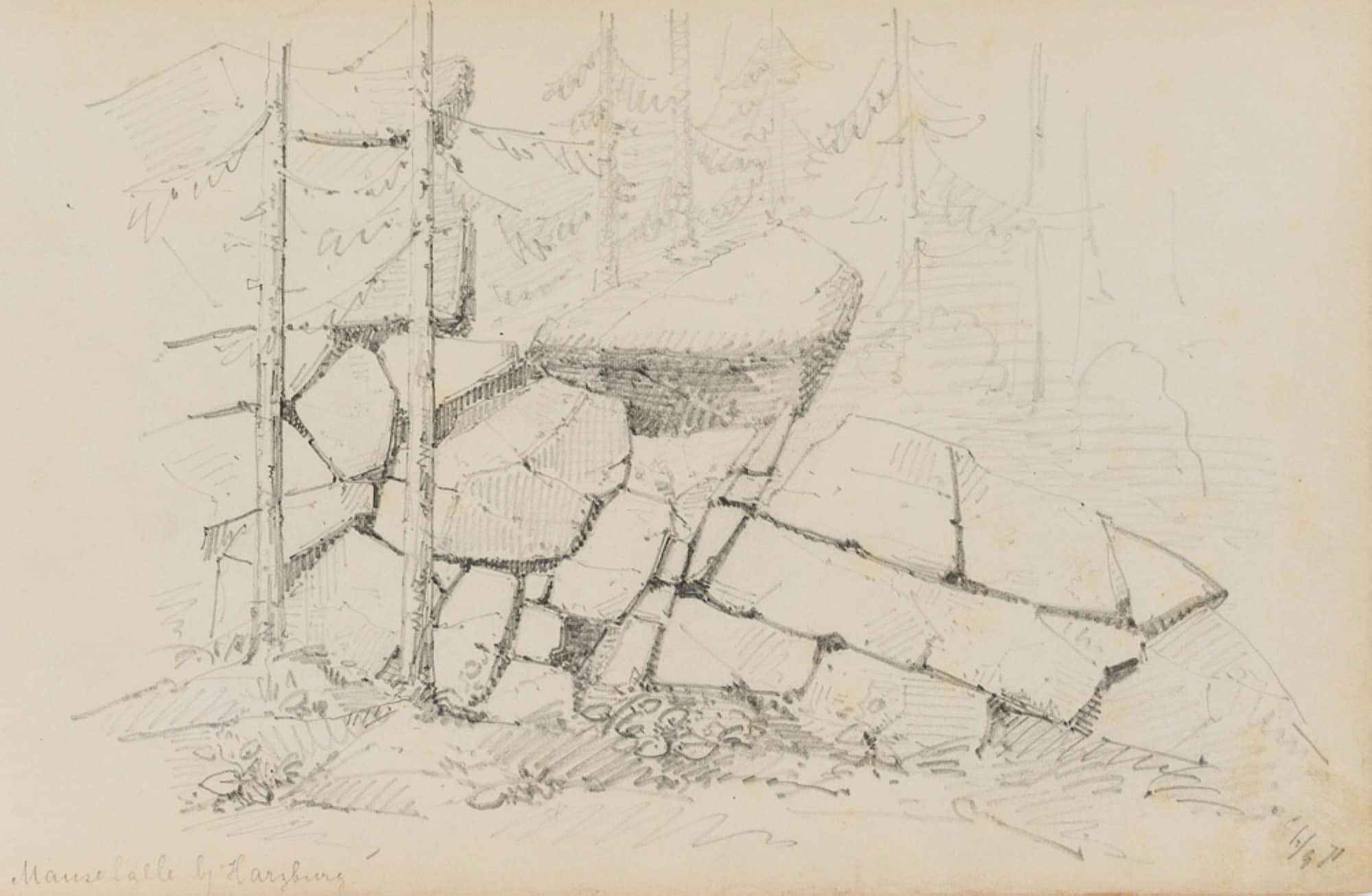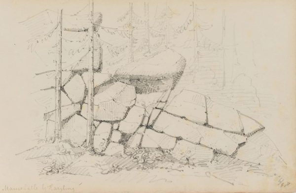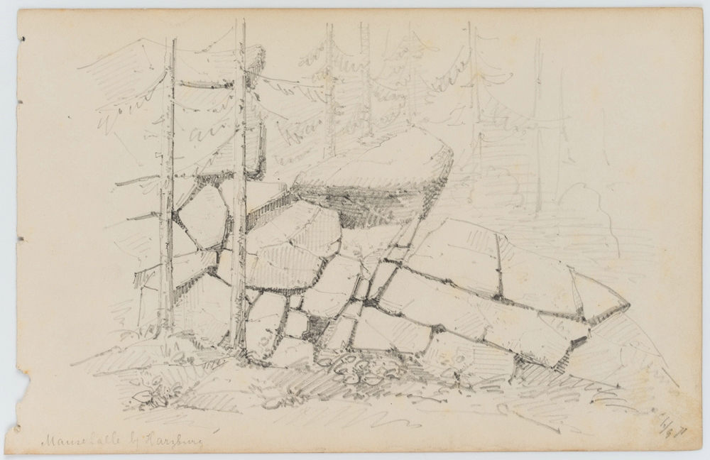 - Description: Sketchy view of the fragile, naturally formed rock formation above the Oker Valley in the Harz Mountains. Near the path between the Kästeklippen and the Romkerhall waterfall, the anonymous artist transferred this strange structure into his sketchbook during his journey through Germany.