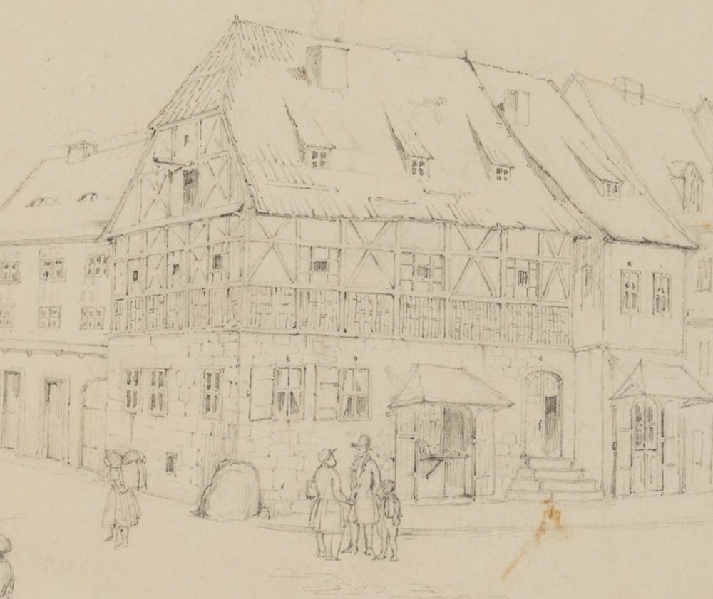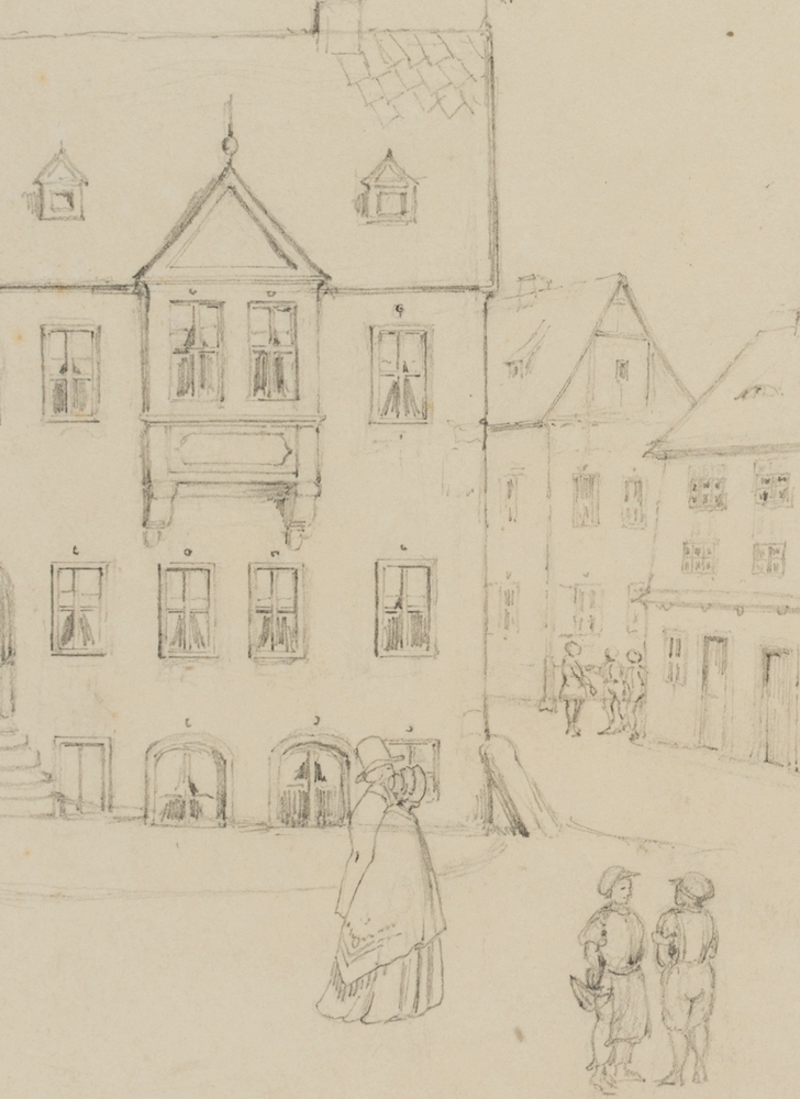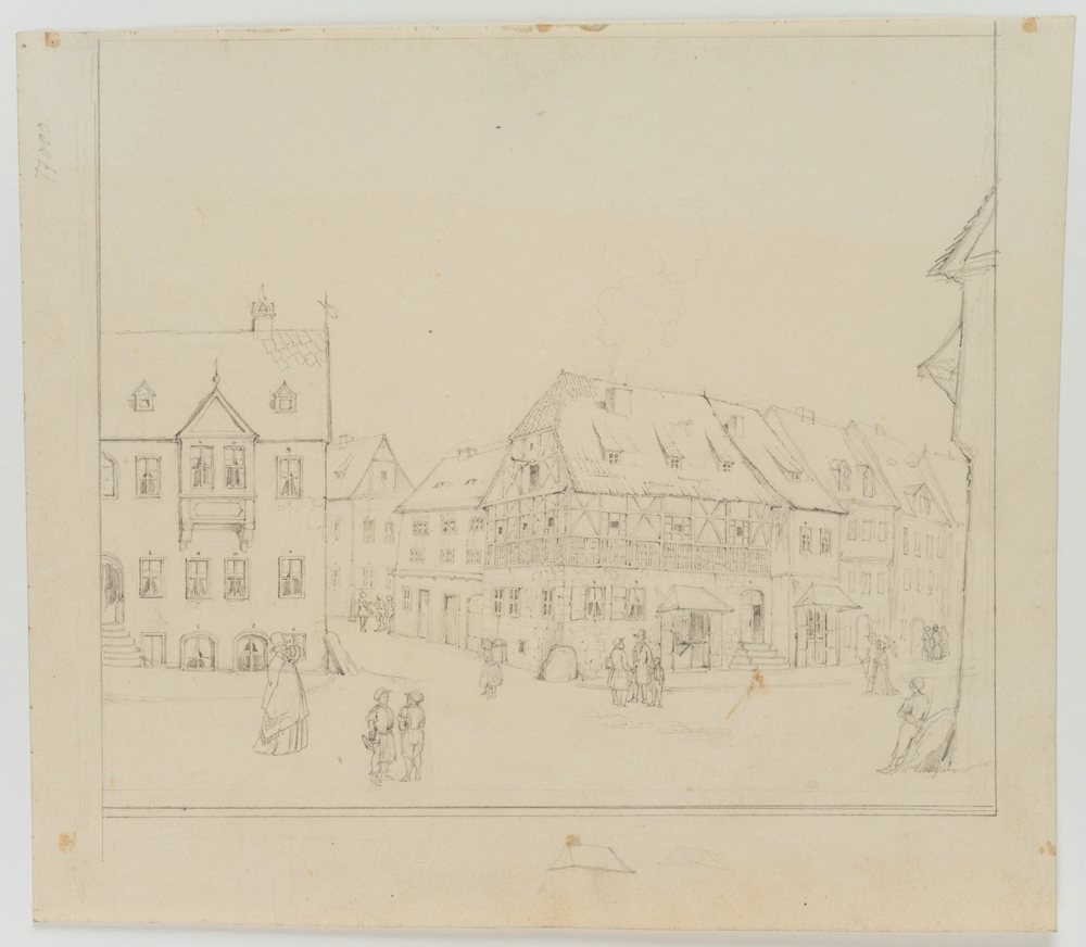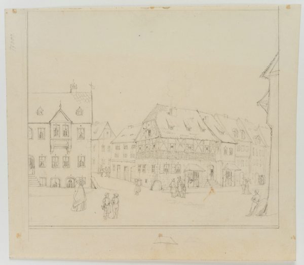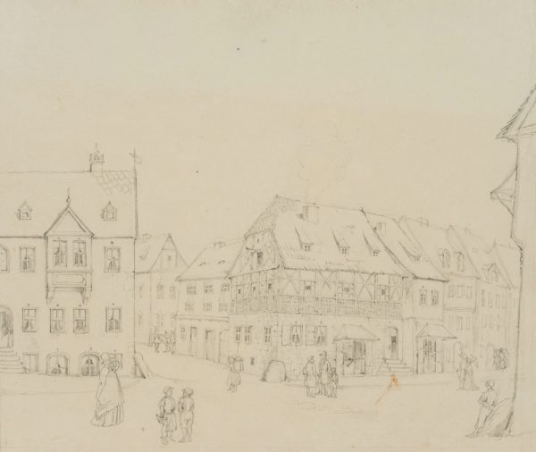 - Beschreibung: Die Darstellung zeigt die Hauptstraße eines Ortes mit mittelalterlicher und renaissancezeitlicher Bebauung. Die Straße ist durch zahlreiche Personen belebt, die ihrem alltäglichen Handwerk nachgehen oder in eleganter Kleidung flanieren. Papier mit Wasserzeichen und Datierung 1854