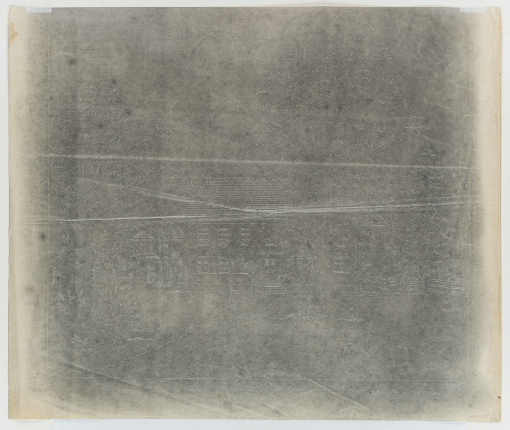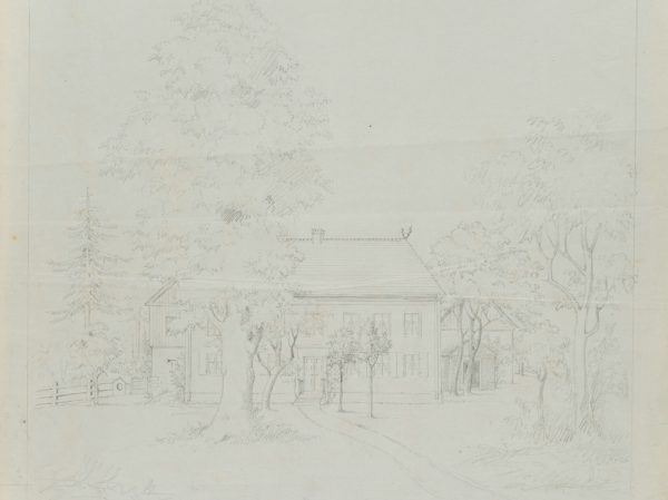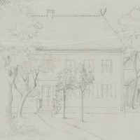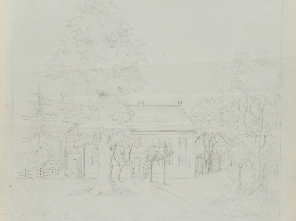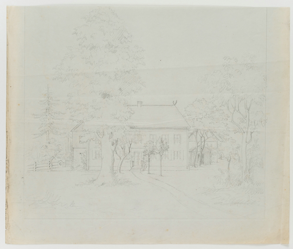 - Description: The depiction shows a forester’s house with outbuildings idyllically situated at the edge of the forest. A mighty tree stands in the garden in front of the house. On the reverse side, the paper is full-page ruled.
