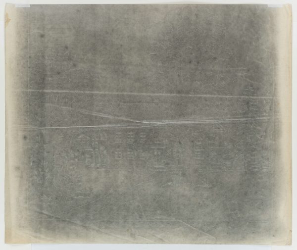 - Beschreibung: Die Darstellung zeigt eine idyllisch am Waldrand gelegenes Forsthaus mit Nebengebäuden. Im Garten vor dem Haus steht ein mächtiger Baum. Rückseitig ist das Papier ganzseitig gegriffelt.