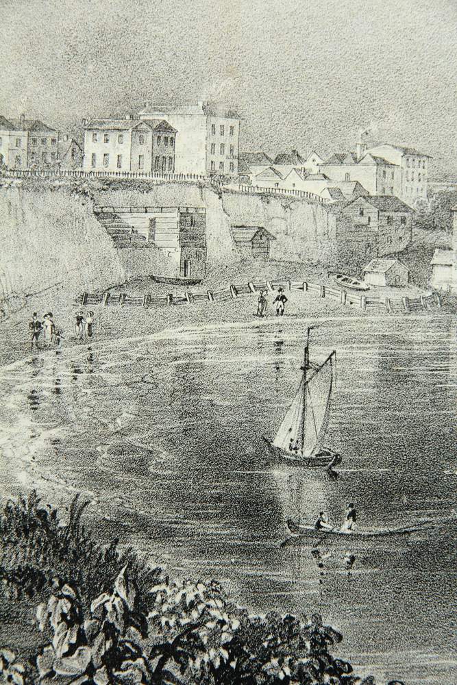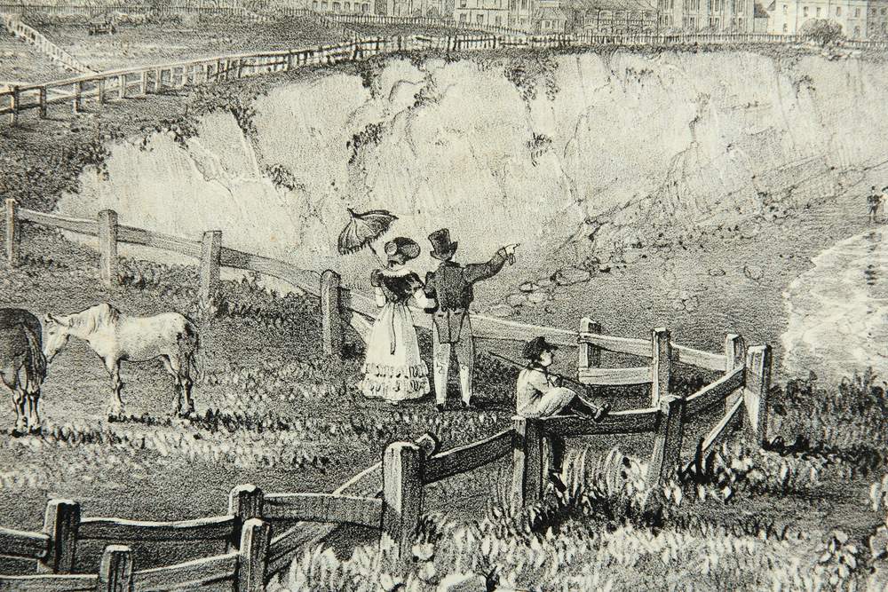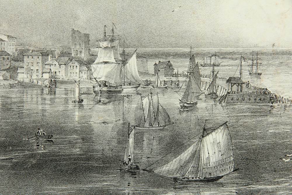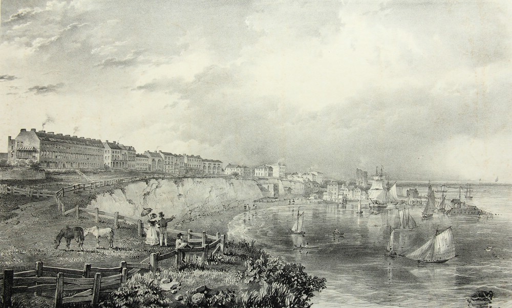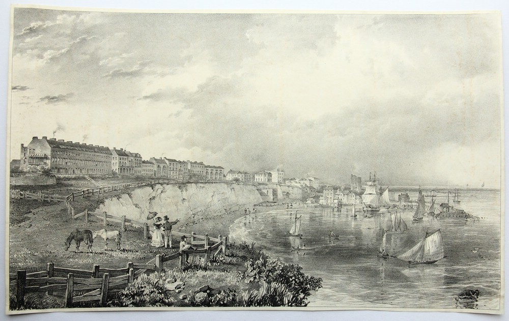 - Beschreibung: Vermutlich von einem englischen oder französischen Künstler um 1820 erstellt. Von erhöhtem Standpunkt öffnet sich der Blick über eine Grasfläche mit schlichter klassizistischer Bebauung. An einer Steilklippe steht ein Paar, gekleidet in die Mode des Biedermeier, und blickt auf den darunterliegenden Hafen mit zahlreichen Segelbooten und Segelschiffen.
