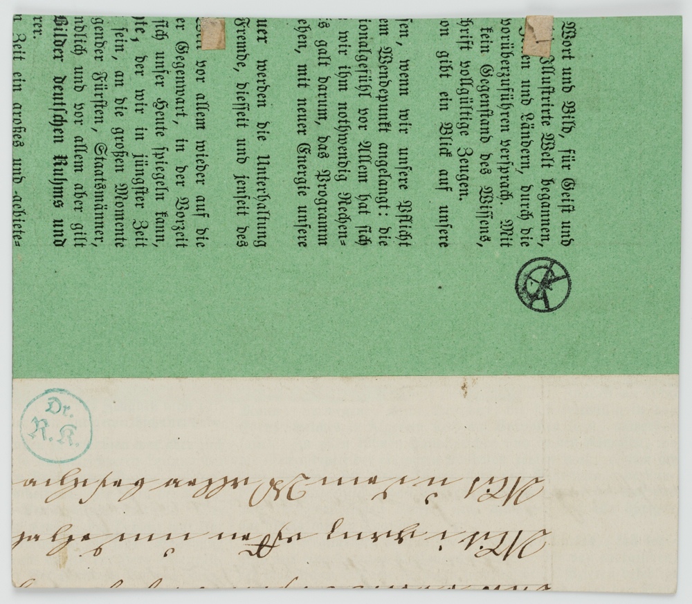 - Zustand: Guter Zustand. Das Blatt ist altersbedingt verfärbt und stellenweise blass verschmutzt. Die Blattecken sind minimal bestoßen.