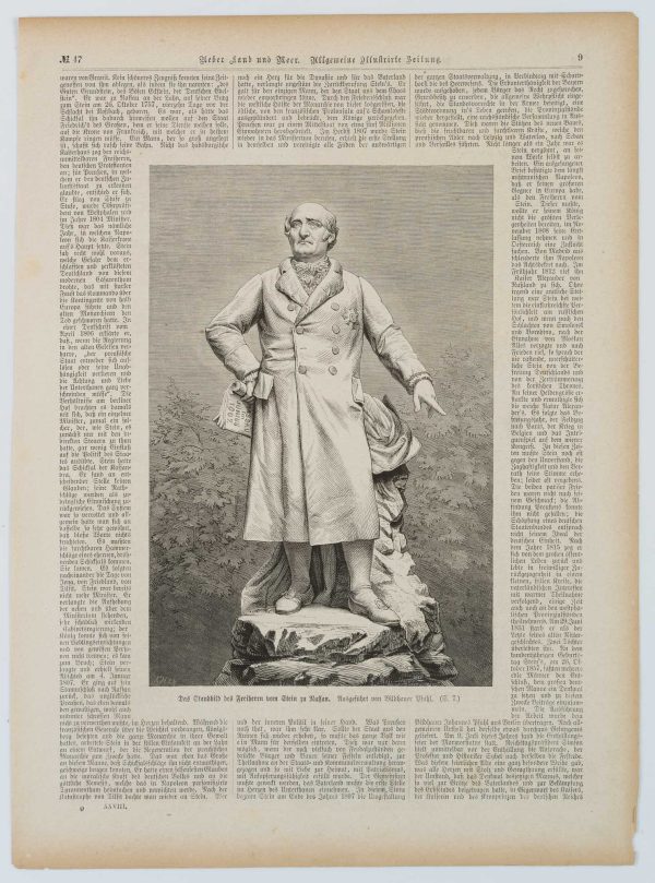 - Inscription: Inscribed „E. H. XA.“ at lower left in the image, monogrammed „V.F.“ at lower right in the image. Below titled „Das Standbild des Freiherrn von Stein zu Nassau. Executed by the sculptor Pfuhl“. From: „Allgemeine Illustrierte Zeitung“, No. 47.