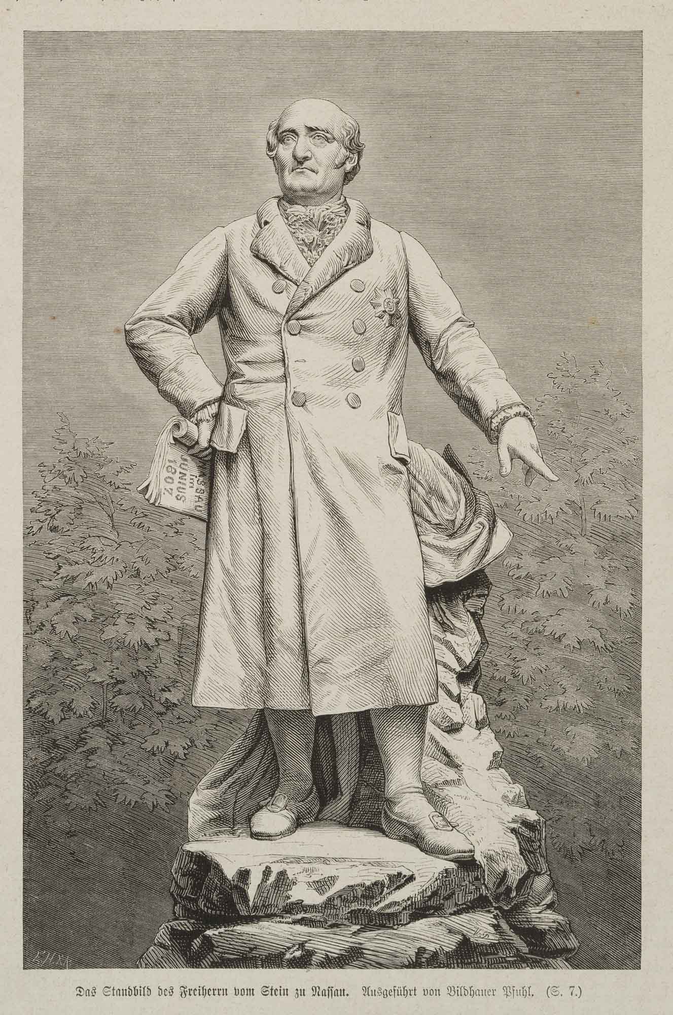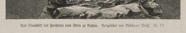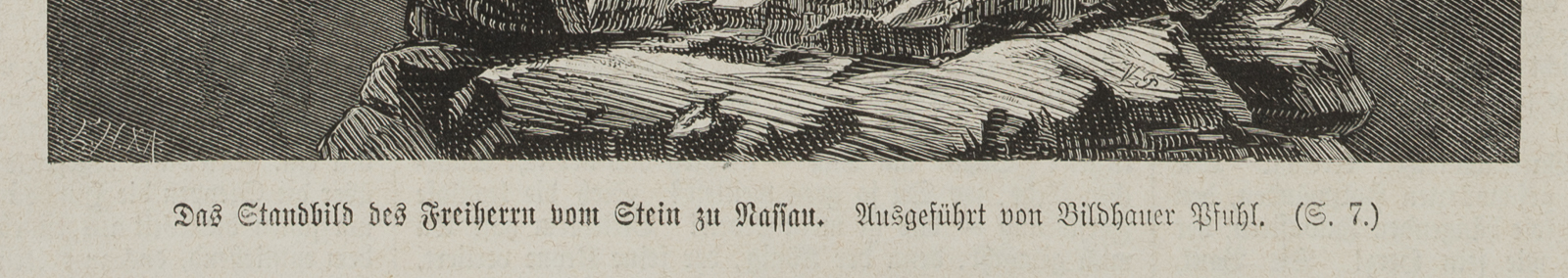 - Bezeichnung: Unten links in der Darstellung bezeichnet „E. H. XA.“, rechts unten in der Darstellung monogrammiert „V.F.“ Darunter betitelt „Das Standbild des Freiherrn von Stein zu Nassau. Ausgeführt von Bildhauer Pfuhl“. Aus: „Allgemeine Illustrierte Zeitung“, No. 47.