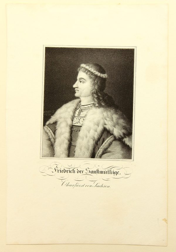 - Beschreibung: Porträt von Friedrich dem Sanftmütigen (1412-1464), Kurfürst von Sachsen. Lithographie auf festem Papier. In Darstellung ím Stein möglicherweise Signatur des Künstlers und Datierung auf 1834? Rückseitig befindet sich ein unbekannter Sammlungsstempel.