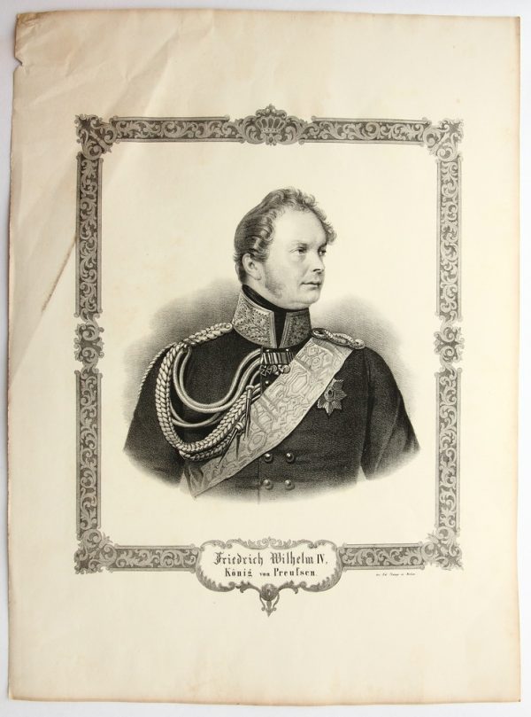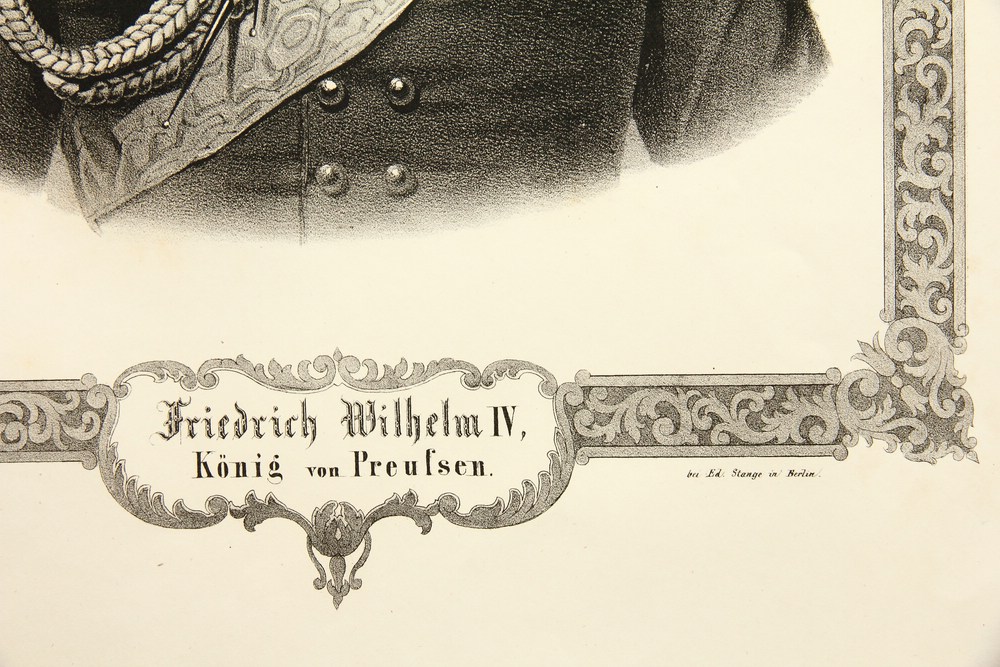 - Description: Portrait of a bust in quarter profile. The portrait is surrounded by an ornamental frame, which bears a cartouche with the sitter’s name at the bottom. The print was made by “Ed. Stange in Berlin”. Please also note the matching portrait of Frederick William IV’s wife, Queen Elisabeth Louise of Prussia in our offer.