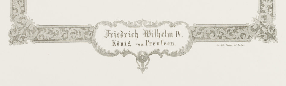 - Bezeichnung: Unten mittig im Stein bezeichnet: “Friedrich Wilhelm IV. König von Preussen”, rechts bezeichnet: “bei Ed. Stange in Berlin”