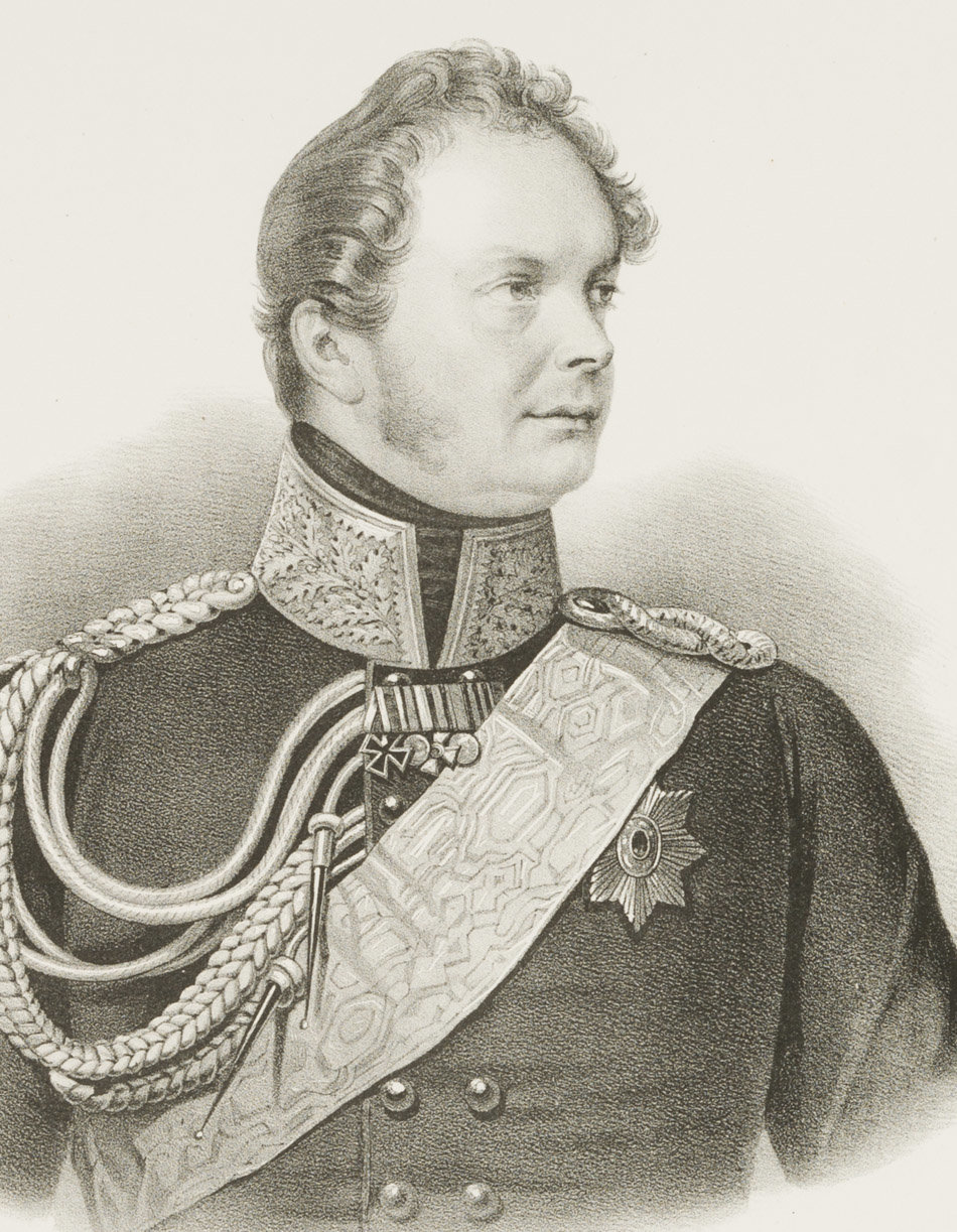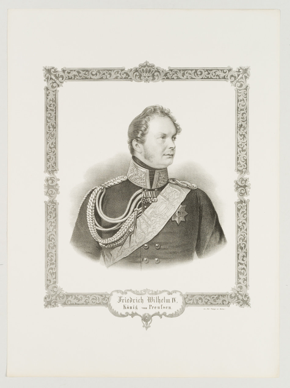 With youthful verve, the King of Prussia, Frederick William IV of the House of Hohenzollern (1795 Berlin – 1861 Potsdam) is depicted in this bust portrait. The young king, who took the Prussian throne in 1840 to the great jubilation of the liberal population, presents himself in a posture that is almost typical of his portraits, with his chest frontal and his head turned to one side. Influenced by the ideals of Romanticism and inclined to the idea that he had found an exemplary system of government in the Holy Roman Empire of the Middle Ages, his mindset corresponded to that of many of his subjects. The radical restoration policy previously implemented by his father Frederick William III in the course of the Napoleonic Wars was no longer pursued by the young king, but was relaxed with greater freedoms for the bourgeoisie and religious groups. It is therefore hardly surprising that he was offered the imperial crown by the Frankfurt National Assembly in 1849, but he rejected it. His self-image as a ruler corresponded to a monarch appointed by God who did not need the “crown from the gutter”. Frederick William’s sometimes contradictory attitude in this matter was taken up in several caricatures of a Janus-faced ruler.Here Frederick William IV is shown proud and self-confident in a parade uniform with sash and medals. The lithograph shows a very fine treatment of the subject of the picture, which was drawn on the stone by many fine lines.