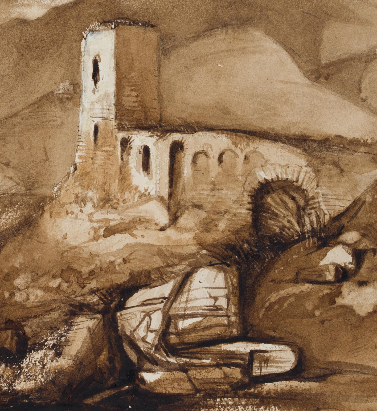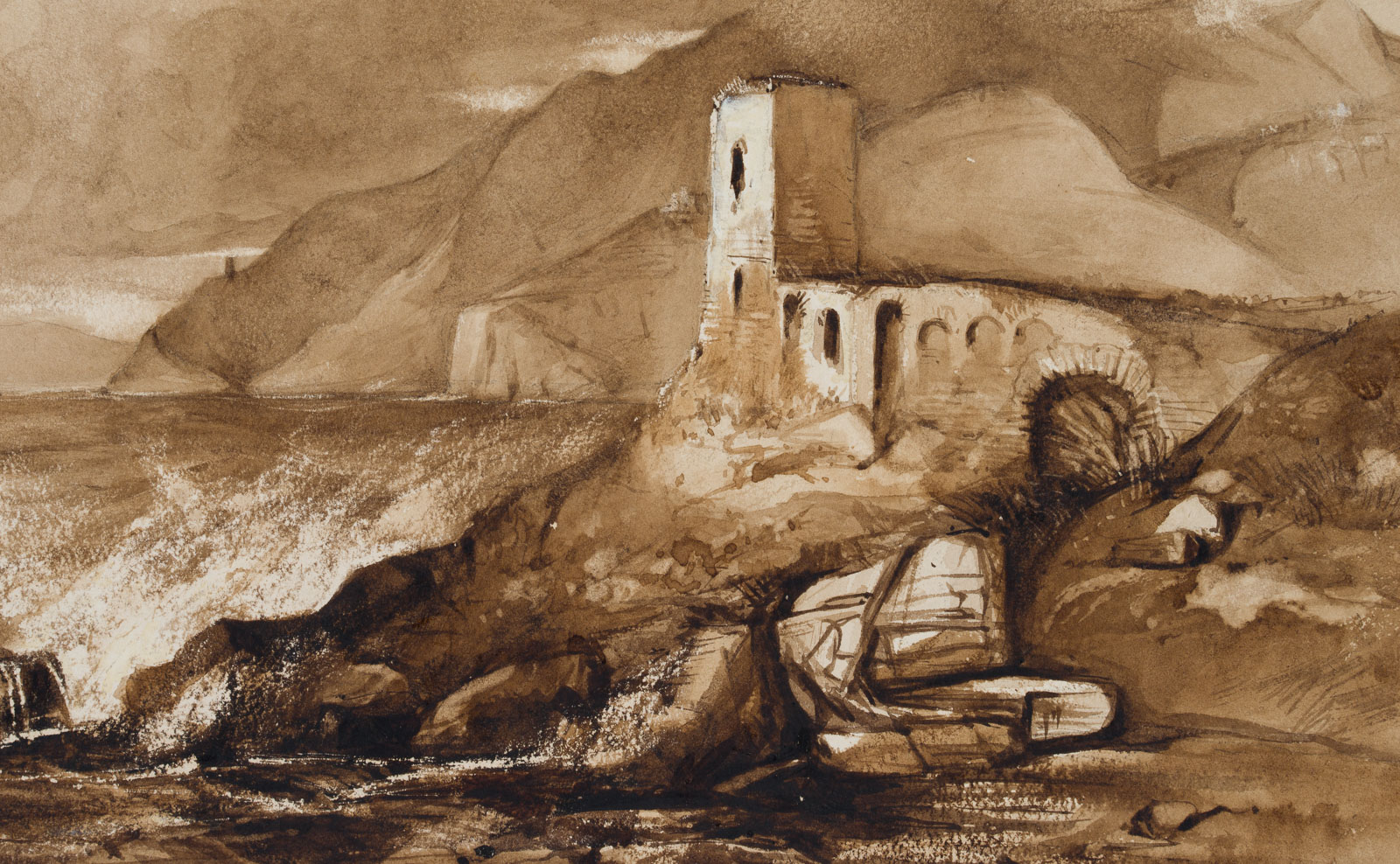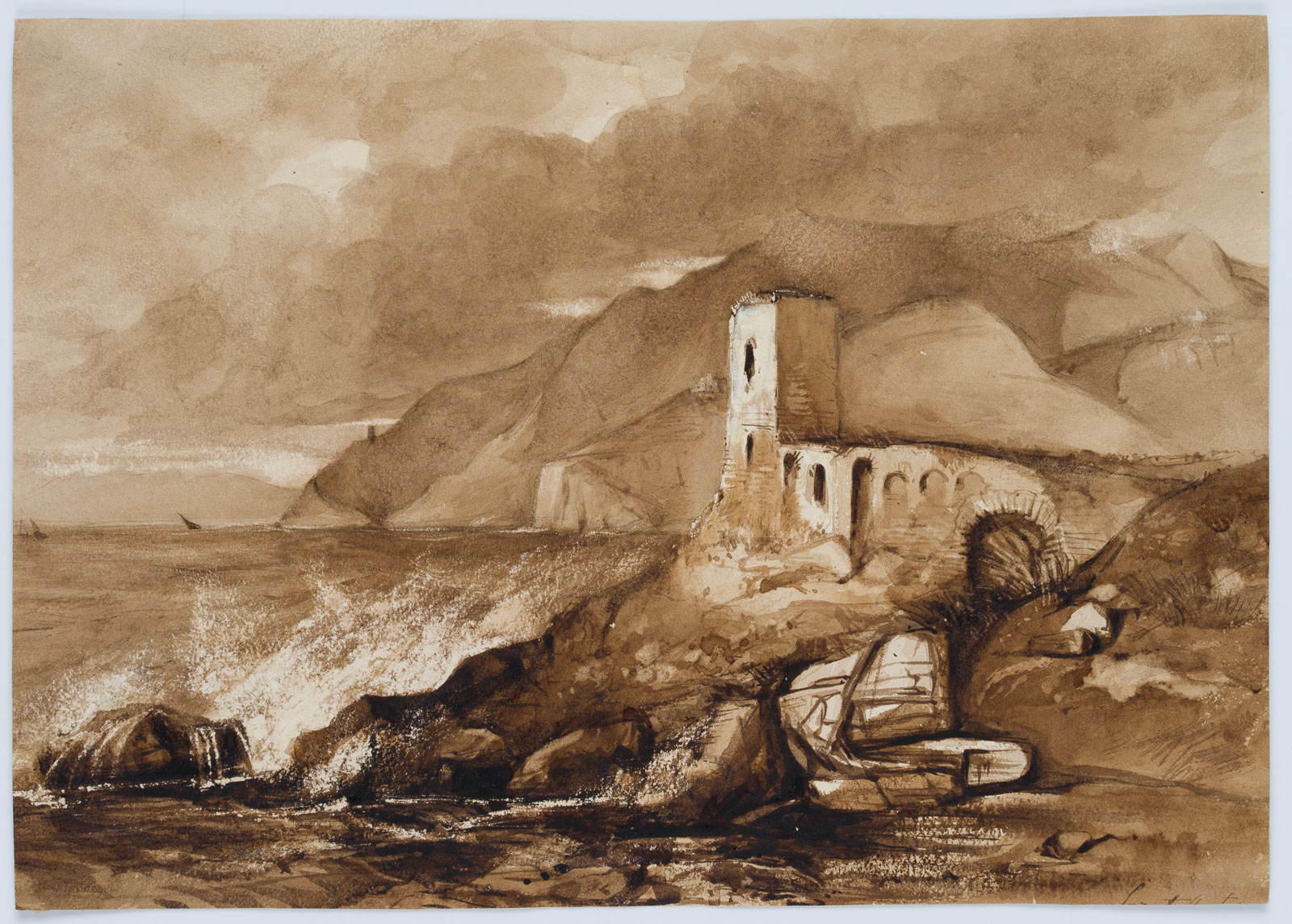 Unknown (19th century), French coast with foaming water waves and ruined church, 1820, Brush drawing