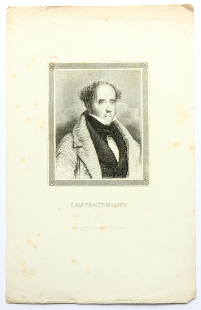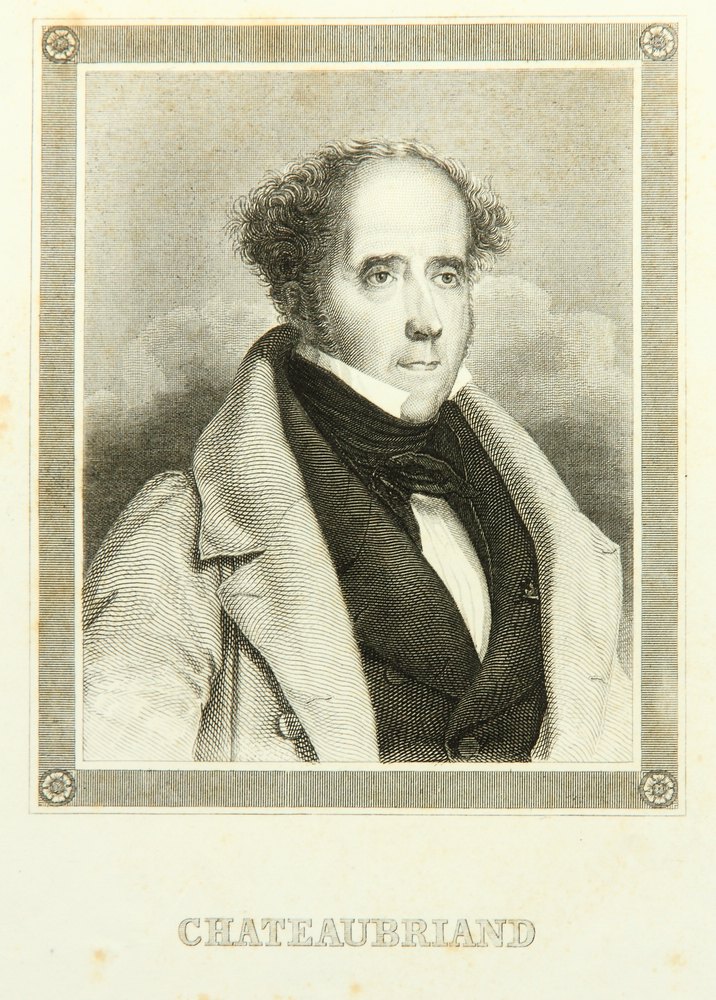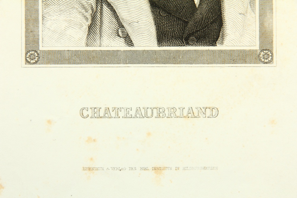 Unbekannt (19. Jahrhundert), Porträt des französischen Schriftstellers und Staatsmannes François-René de Chateaubriand (1768 Saint-Malo – 1848 Paris), gilt als Mitbegründer der Romantik in Frankreich,, 19. Jahrhundert, Kupferstich