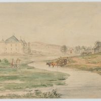 Unbekannt (19. Jahrhundert), Furt am Fluss bei norddeutscher Wasserburg, um 1880, Aquarell