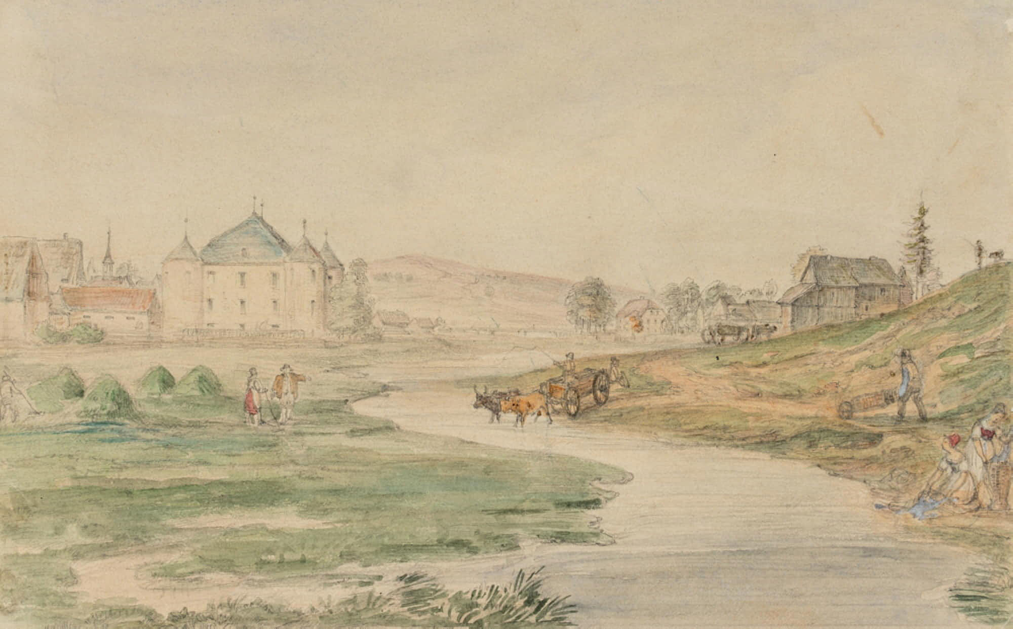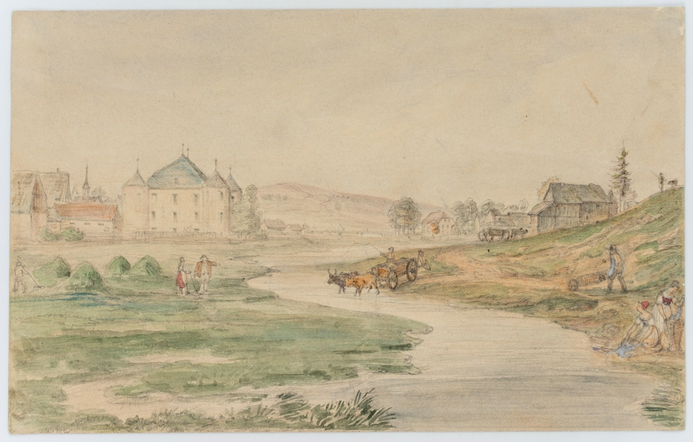 Unknown (19th century), Ford on the river near a North German moated castle, c. 1880, Watercolor