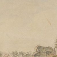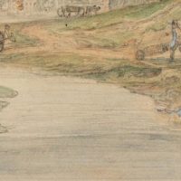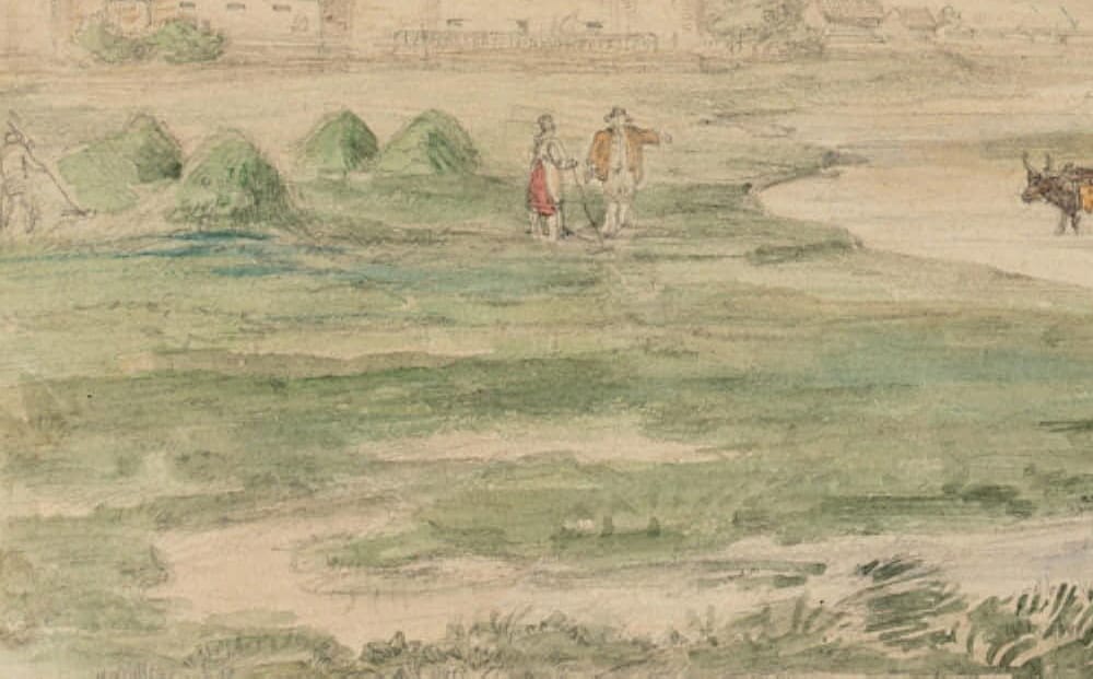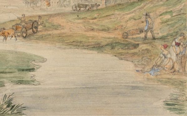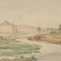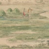 - Description: Veduta by an anonymous artist. Showing a flat landscape along a narrow river with washerwomen at work on the banks. In the centre an ox team drives through a ford. In the background a water bridge with four round corner towers can be seen. The veduta probably shows a North German, Dutch or Scandinavian landscape.