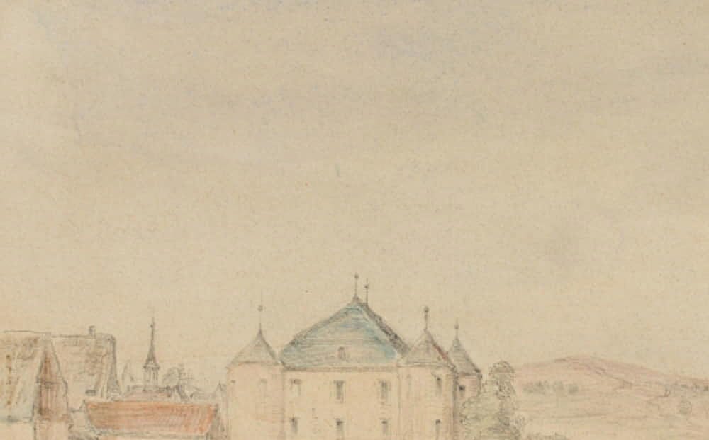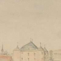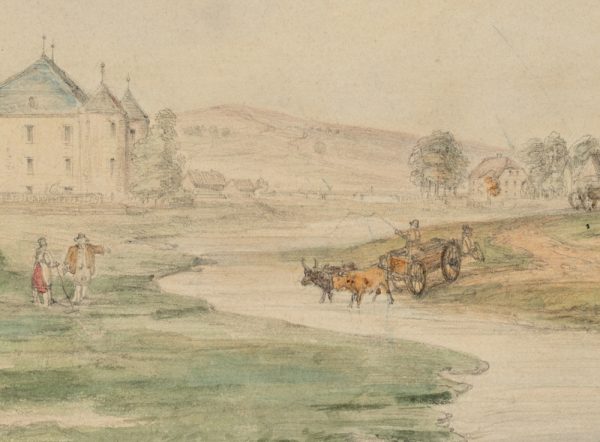 - Beschreibung: Vedute eines anonymen Künstlers. Zeigt eine flache Landschaft an einem schmalen Flusslauf, an deren Ufern Wäscherinnen bei der Arbeit sind. Mittig fährt ein Ochsengespann durch eine Furt. Im Hintergrund ist eine Wasserbrug mit vier runden Ecktürmen zu sehen. Vermutlich zeigt die Vedute eine norddeutsche, niederländische oder skandinavische Landschaft.