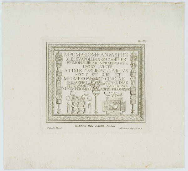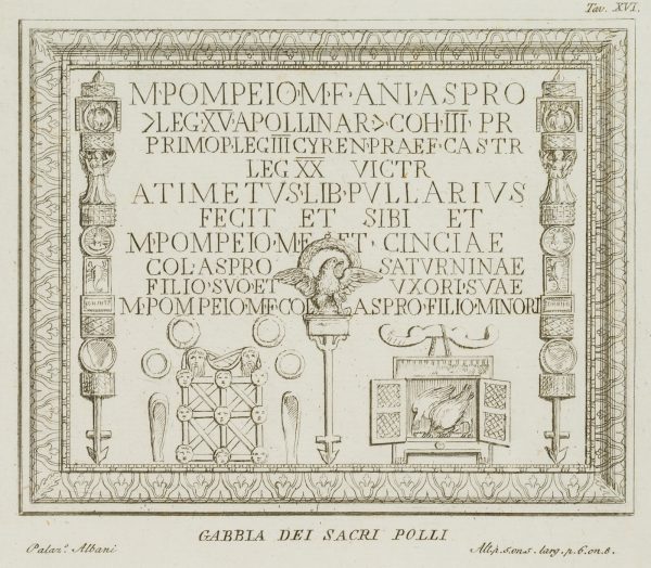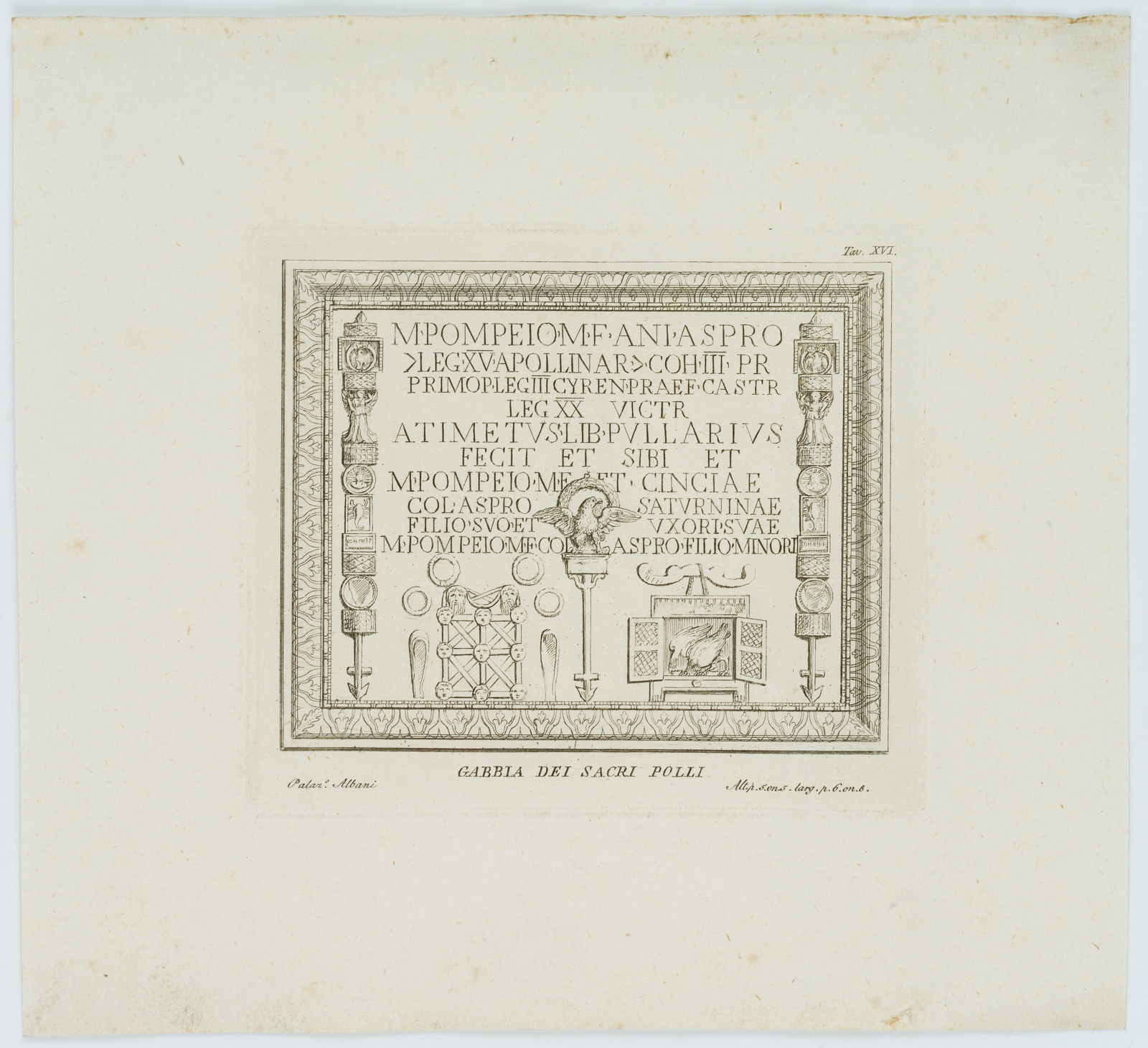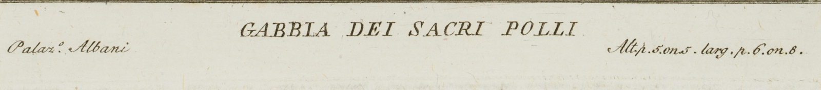 - Inscription: Inscribed below the image in the printing plate with “Gabbia dei sacri polli”, “Palazo Albani” and “Alt.p.5. on.5. larg. p.6. on 8.”; numbered above with: “Tav. XVI”.