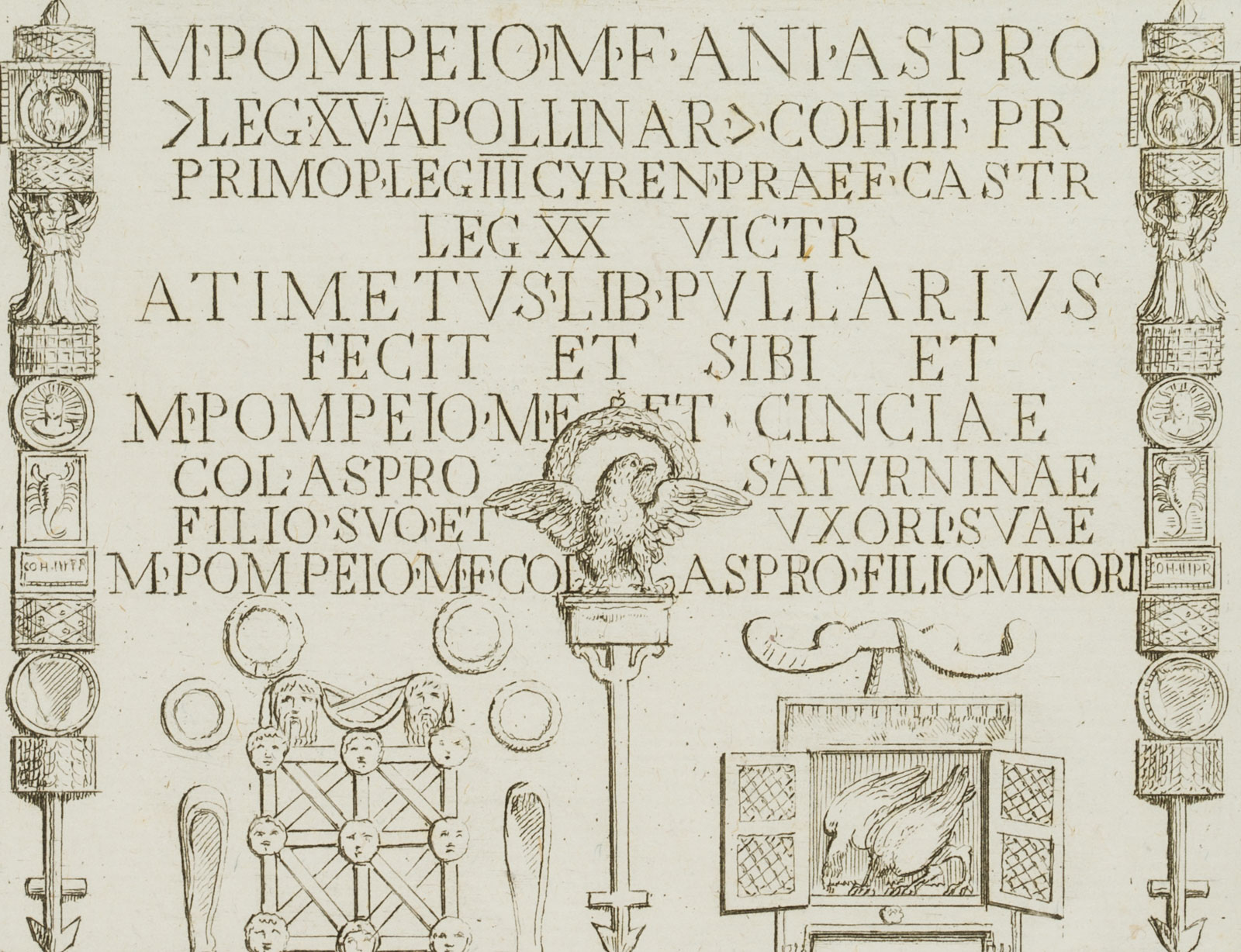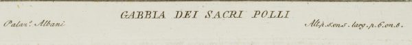 - Bezeichnung: Unterhalb der Darstellung in der Druckplatte bezeichnet mit “Gabbia dei sacri polli”, “Palazo Albani” und “Alt.p.5. on.5. larg. p.6. on 8.”; oberhalb nummeriert mit: “Tav. XVI”.