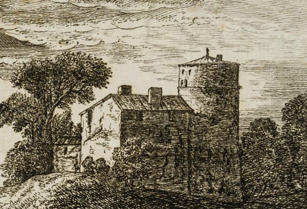Unbekannt (19. Jahrhundert), Rustikales Gehöft mit rundem Turm in der Landschaft, 19. Jahrhundert, Radierung