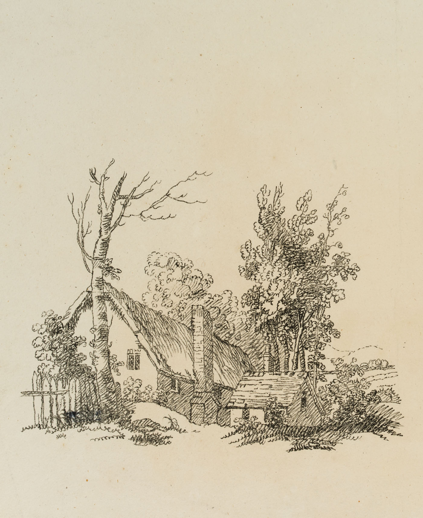 Blatt mit der Darstellung eines Gehöfts in einer Landschaft, wo Bäume und Sträucher das kleine Anwesen umgeben.