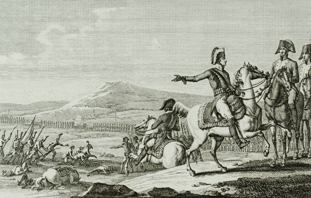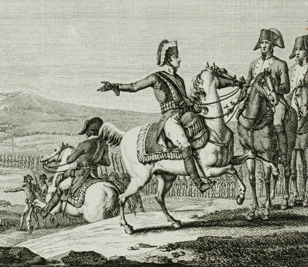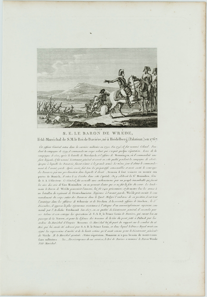 - Beschreibung: bezeichnet “Lecor[…] aquaforti” Zu sehen ist eine Szene aus den Napoleonischen Kriegen. ImVordergrund eine Grupper von Reitern, welche auf eine Szene im Mittelgrund verweisen. Ein Pferd und mehrere Männer liegen dort am Boden. Begleitet wird die Darstellung von einem Text, welcher die militärische Karriere des Dargestellten beschreibt.