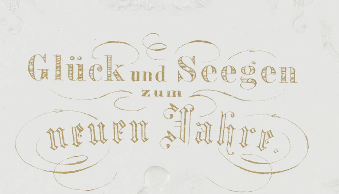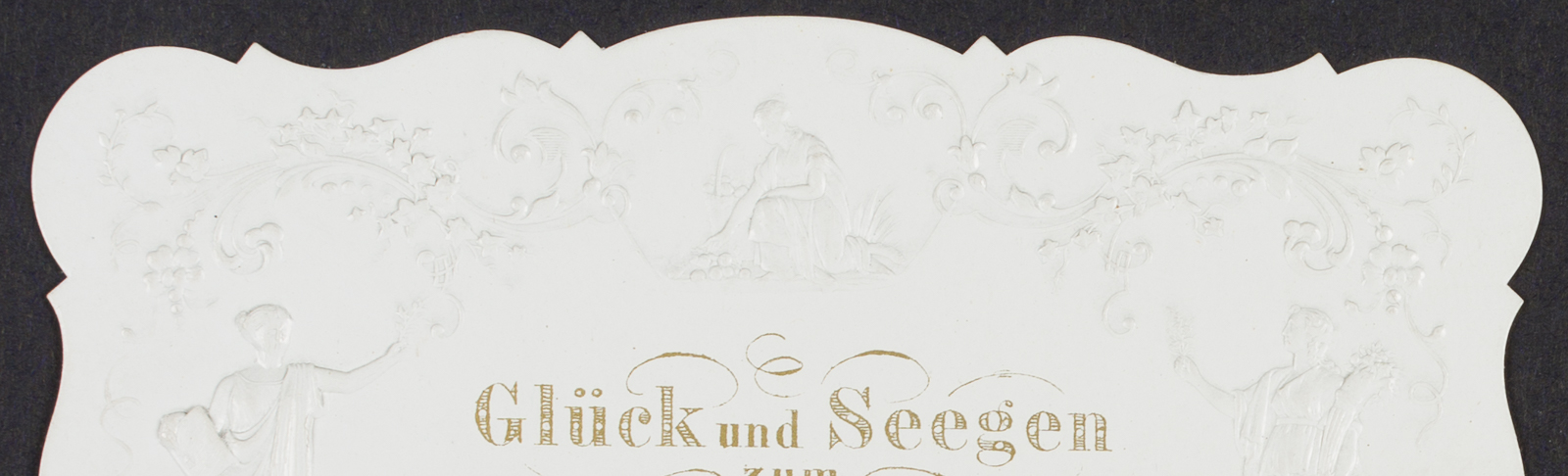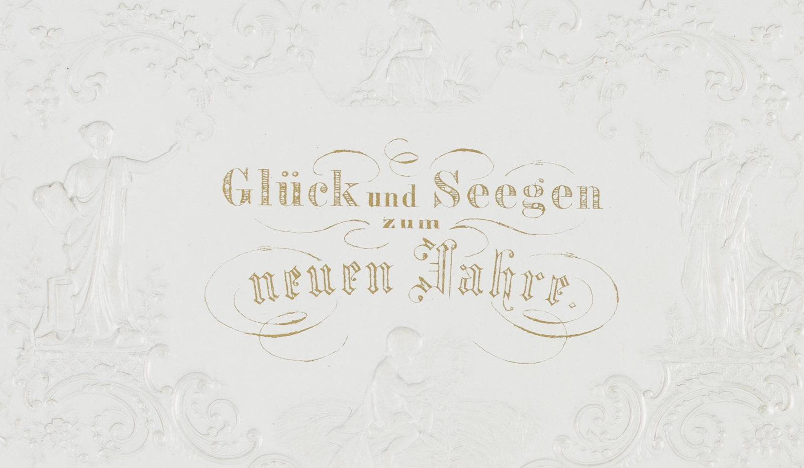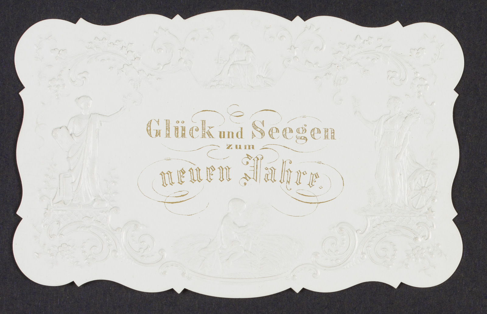 Unbekannt (19. Jahrhundert), Geprägte Glückwunschkarte mit Personifikationen der Jahreszeiten., 19. Jahrhundert, Lithographie
