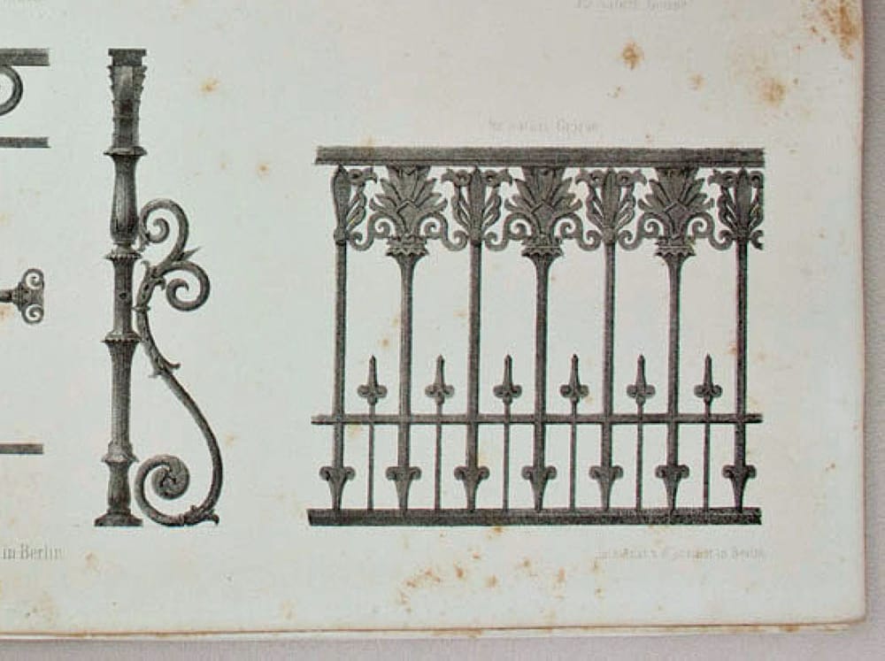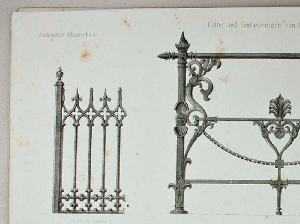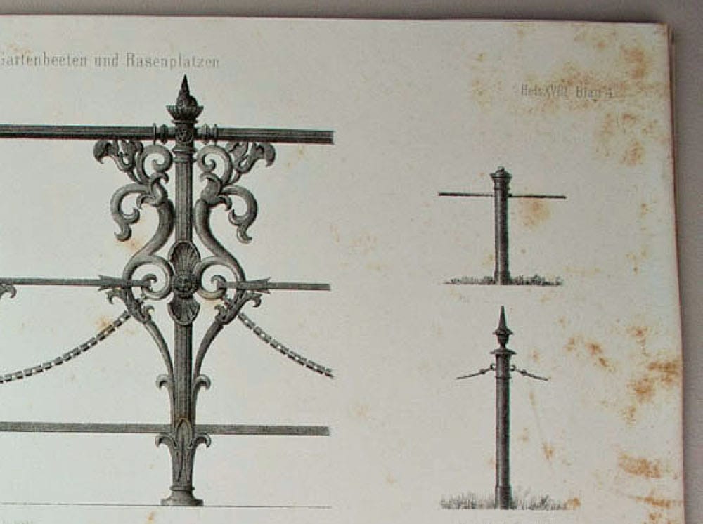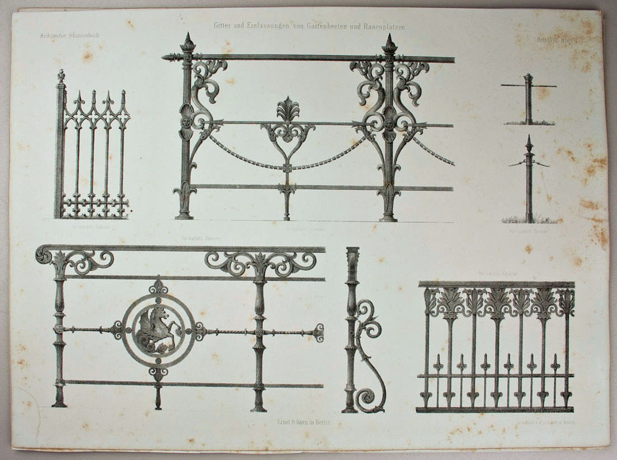 - Description: 1. 7 Grids and borders of garden beds and lawns. (1/12 natural size. Lithograph (1860-1866). Lith. Anst. v. W. Loeillot in Berlin. Booklet XVIII. Sheet 4. size of the sheet: 25,2 x 34,5 cm. From the Architectonisches Skizzenbuch published by Ernst & Korn in Berlin. This is ?La Tête de collection ? the French edition of this contemporary German architecture. The text pages were translated and printed in Paris. The first French edition (July 1860) corresponds with issue 41 of the German edition. The designs are in good condition, the sheet has minor age spotting, a bit more on the right margin.