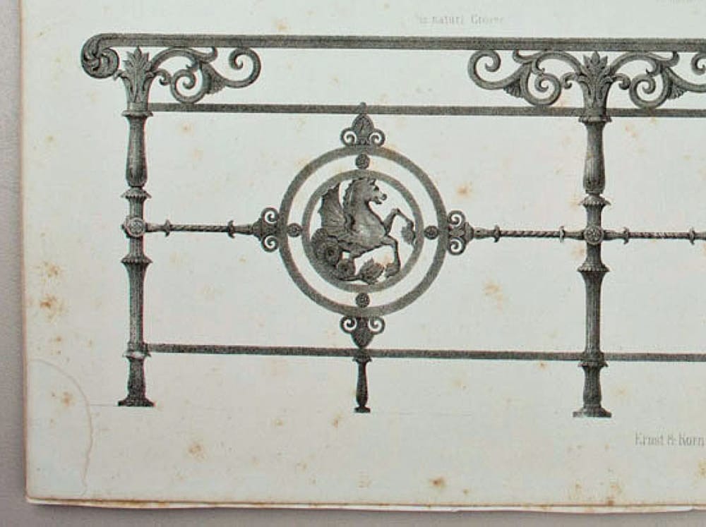 - Beschreibung: 1. 7 Gitter und Einfassungen von Gartenbeeten und Rasenplätzen. (1/12 Naturgröße. Lithographie (1860-1866). Lith. Anst. v. W. Loeillot in Berlin. Heft XVIII. Blatt 4. Größe des Blattes: 25,2 x 34,5 cm. Aus dem Architectonisches Skizzenbuch Verlag Ernst & Korn in Berlin. Es handelt sich hierbei um ?La Tête de collection ? die Französische Ausgabe dieser zeitgenössischen Deutschen Architektur. Die Textseiten wurden übersetzt und gedruckt in Paris. Die erste Französische Ausgabe (Juli 1860) korrespondiert mit der Ausgabe 41 der Deutschen Ausgabe. Die Motive sind in gutem Zustand, das Blatt weist geringfügig Altersflecken auf, am rechten Rand etwas mehr.