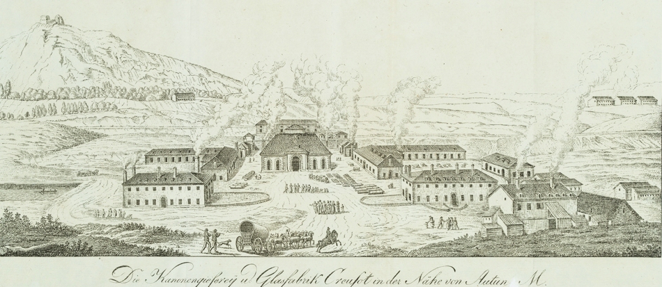 - Schlagworte: Industriegeschichte, Rüstungsindustrie, Waffenproduktion, Kanonengießerei, Glasfabrik, Creusot, Landschaft, Deutschland, Romantik, 1800-1849