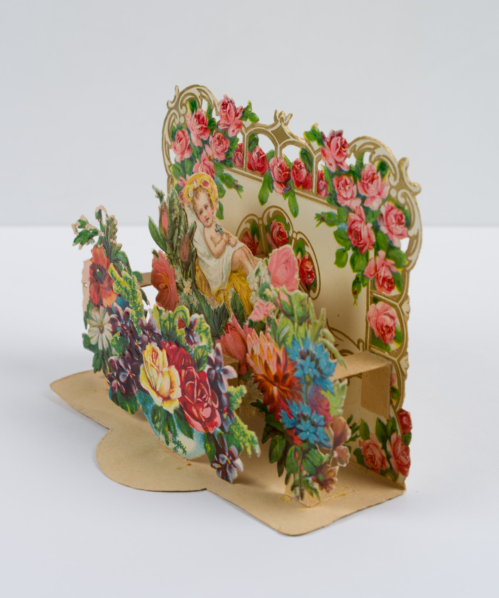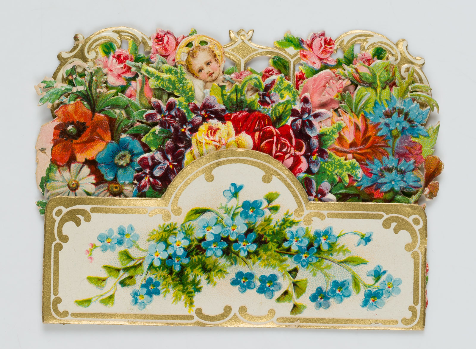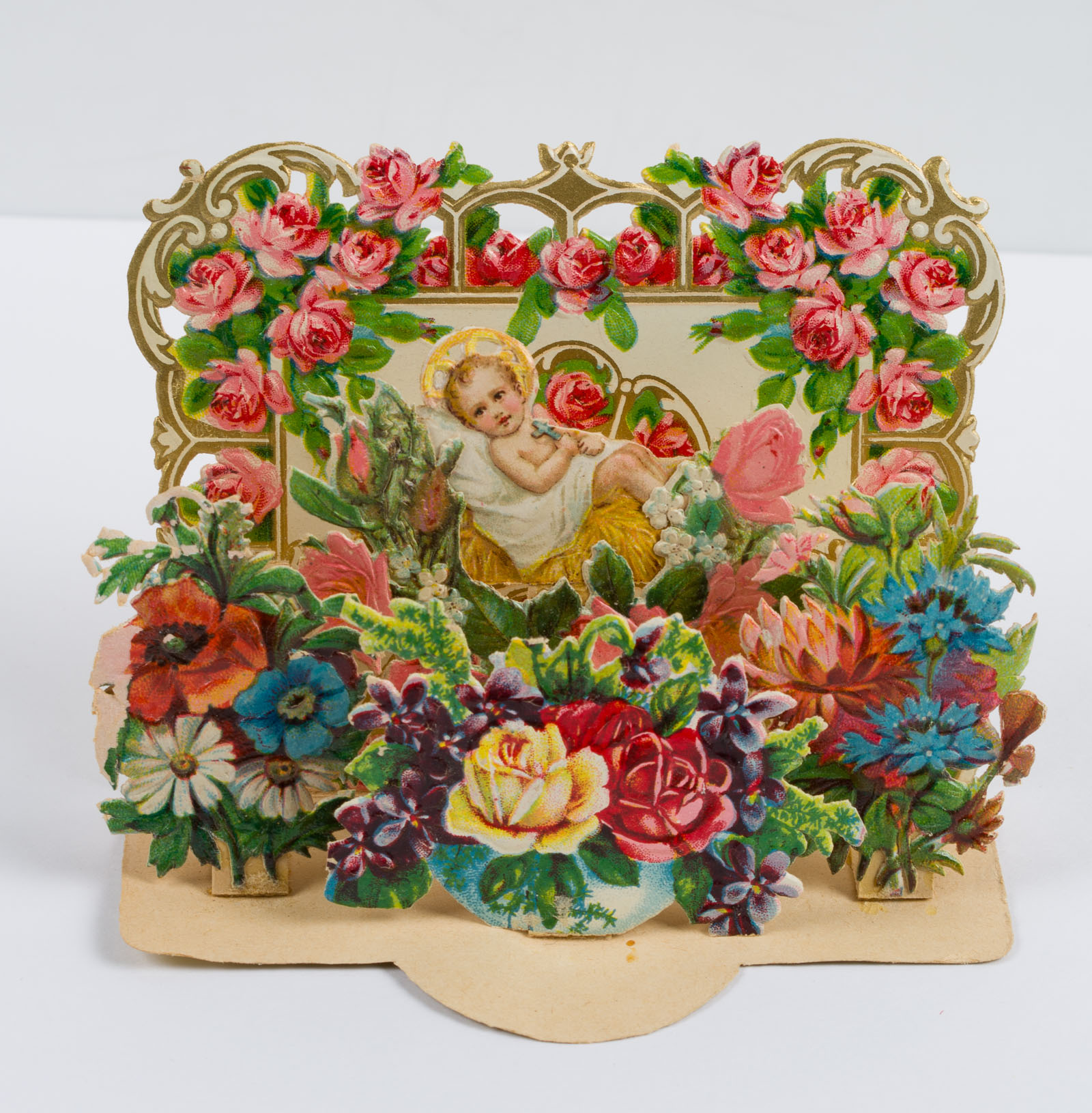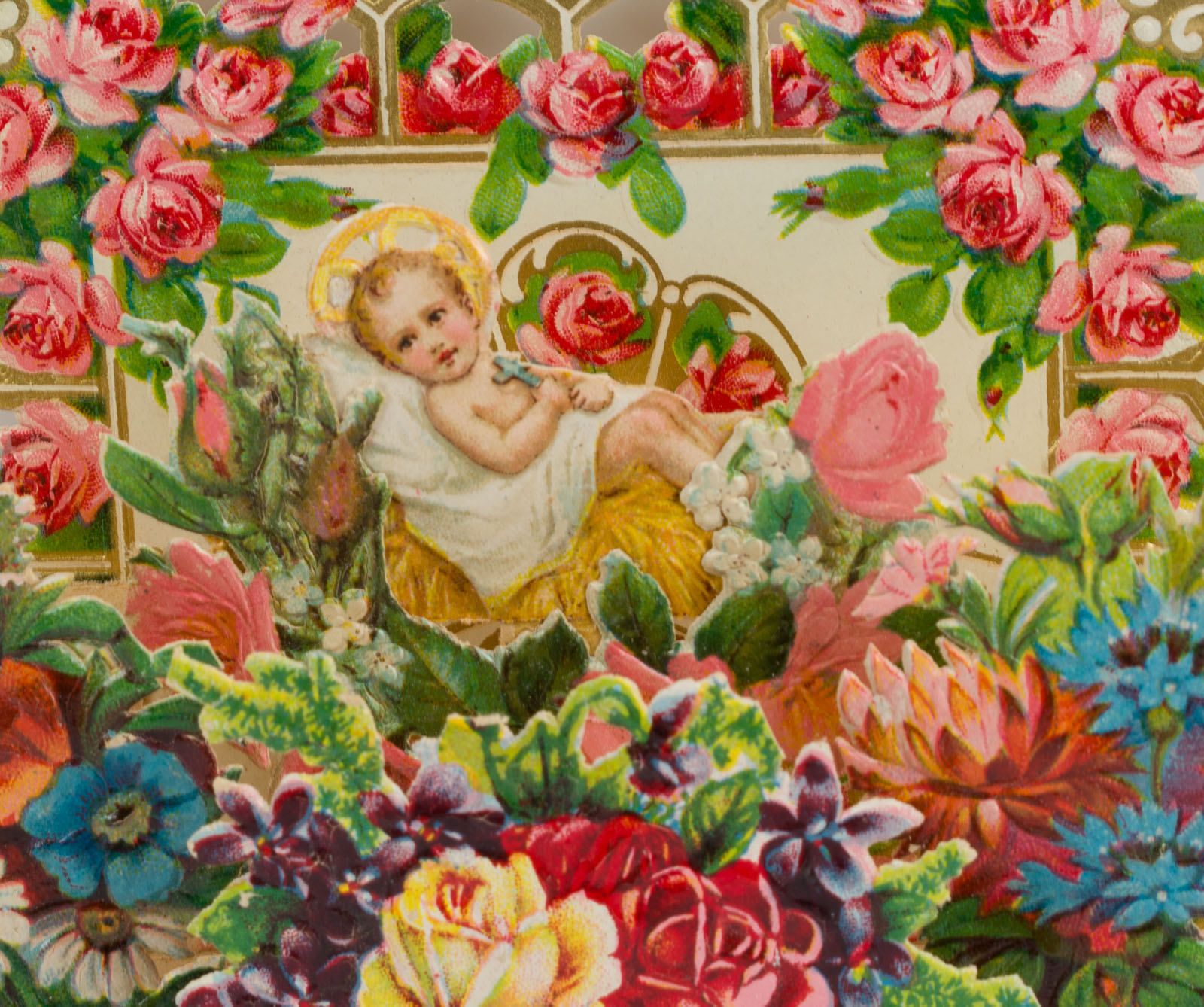 Unknown (19th century), Elaborately designed greeting card with the Christ Child surrounded by flowers, around 1900, chromolithography, c. 1900, Congratulations billet