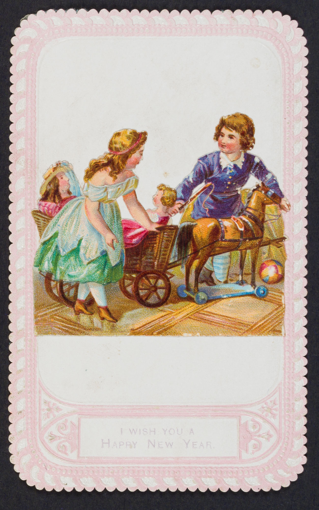- Bezeichnung: Unterhalb beschriftet mit: “I wish you a happy new Year”. Die Karte besteht aus mehreren Papierteilen, die aufeinander geklebt wurden.