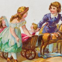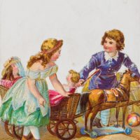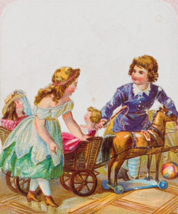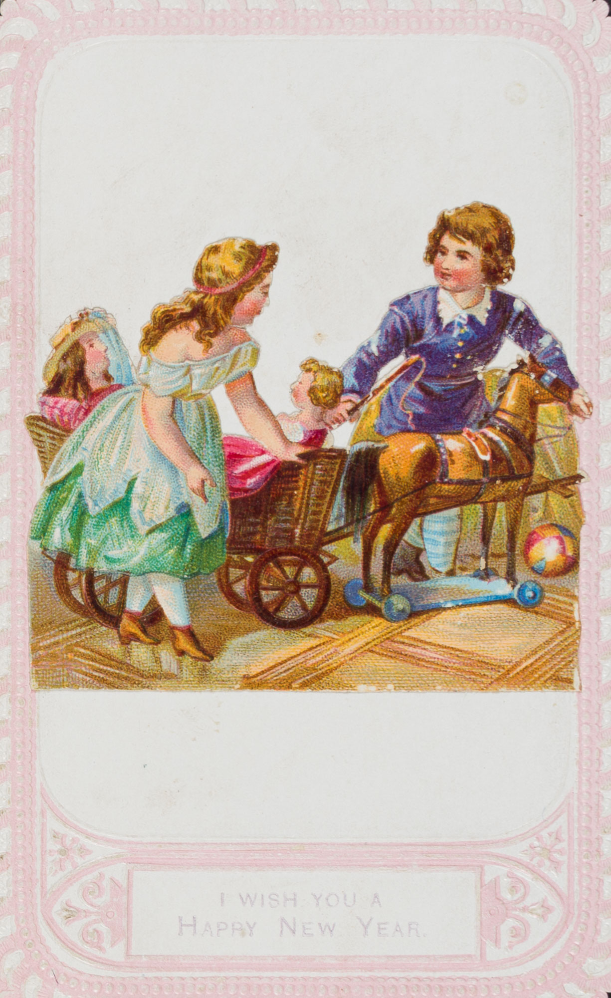 Unbekannt (19. Jahrhundert), Glückwunschkarte. Geschwisterkinder beim Spielen, um 1900, geprägte Litho, um 1900, Chromolithographie