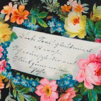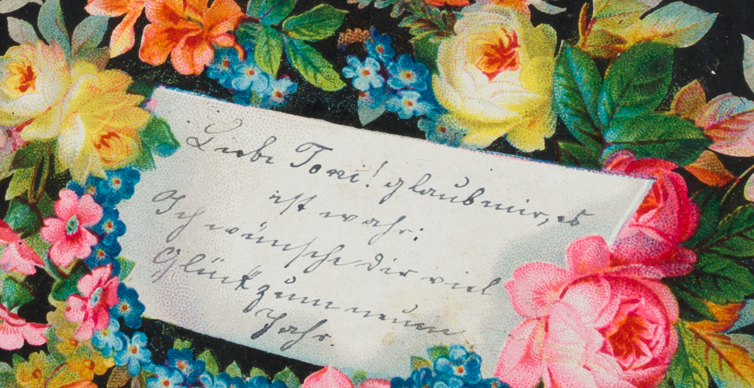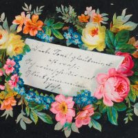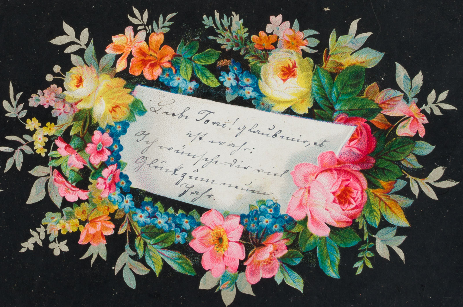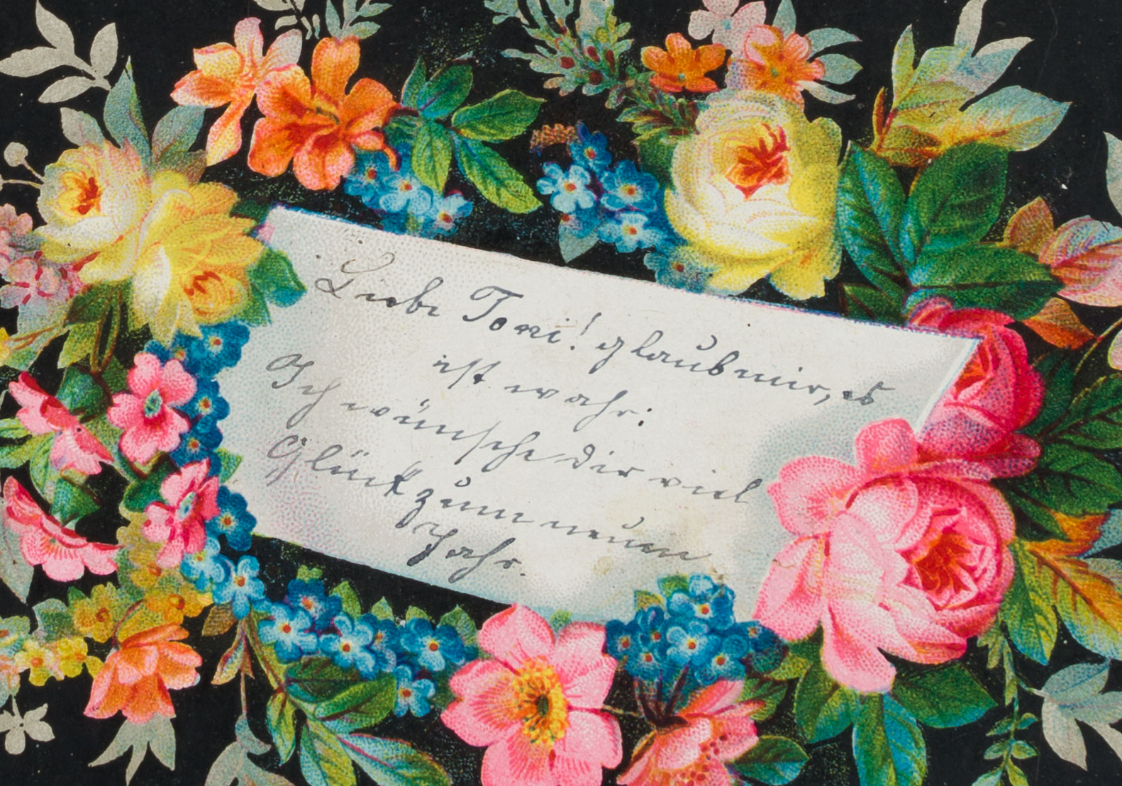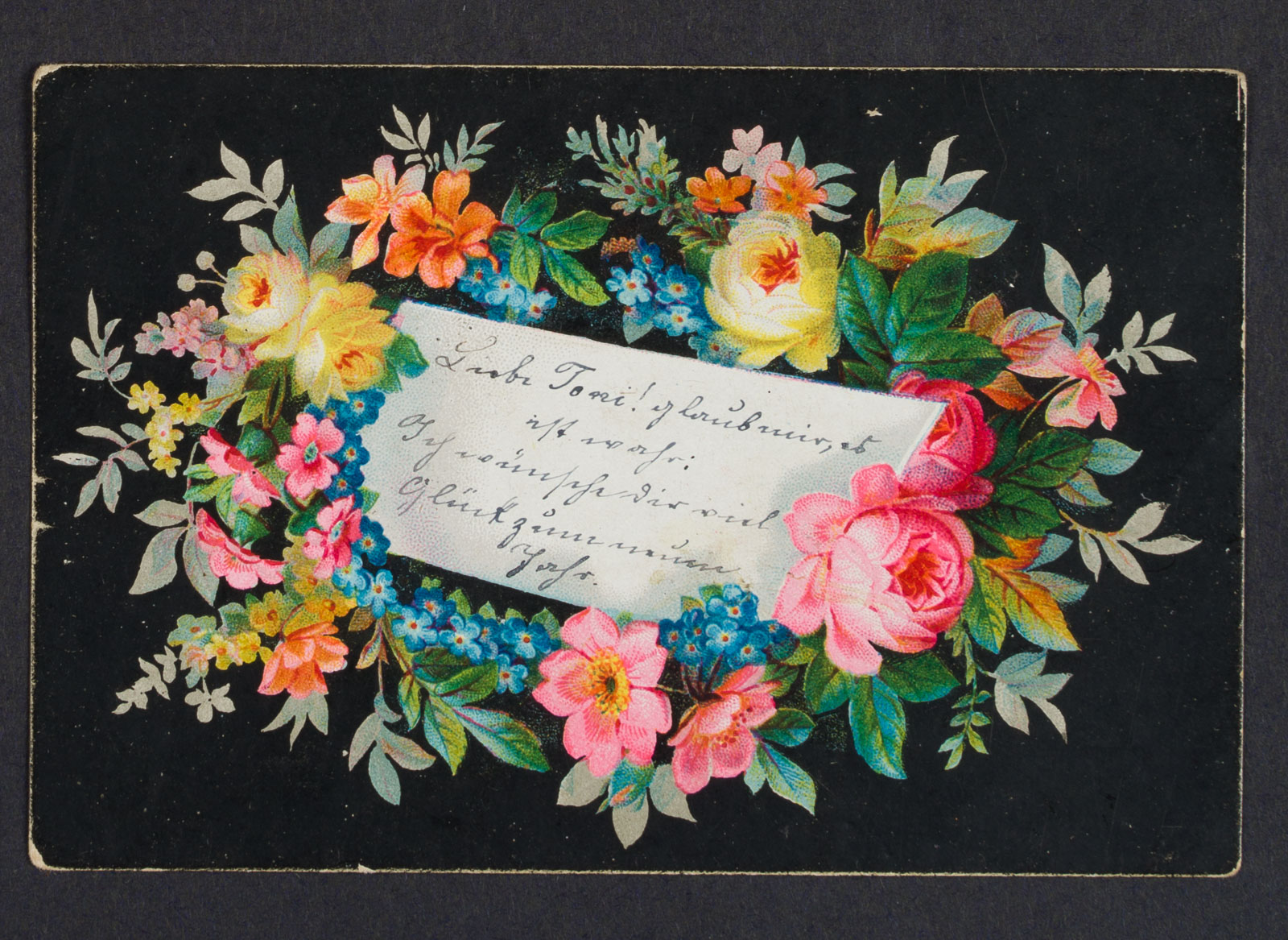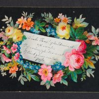 Unknown (19th century), Greeting card with a wreath of magnificent flowers, 19th century, Chromolithograph
