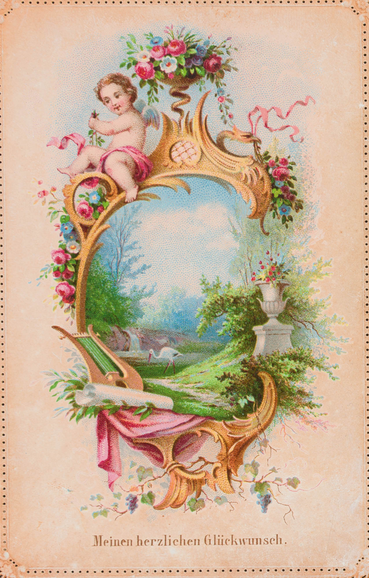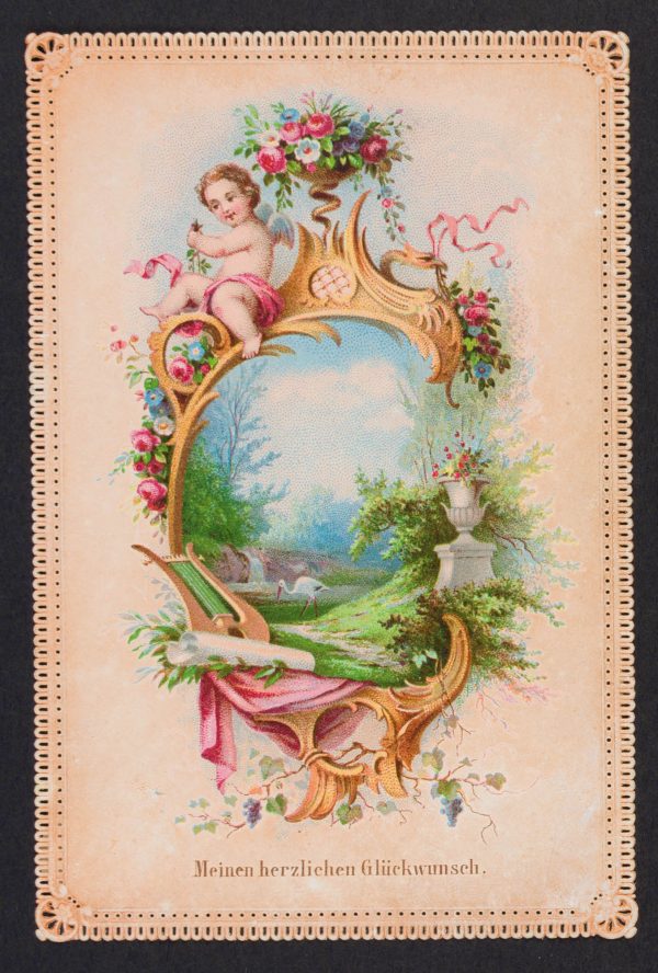 Unbekannt (19. Jahrhundert), Glückwunschkarte mit idyllischem Garten, um 1900, um 1900, Chromolithographie