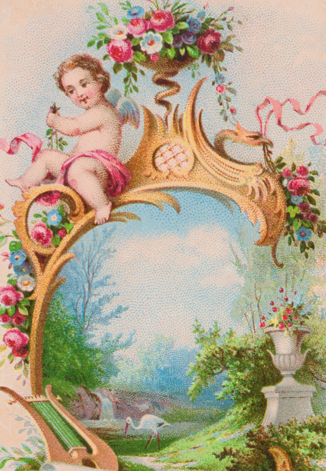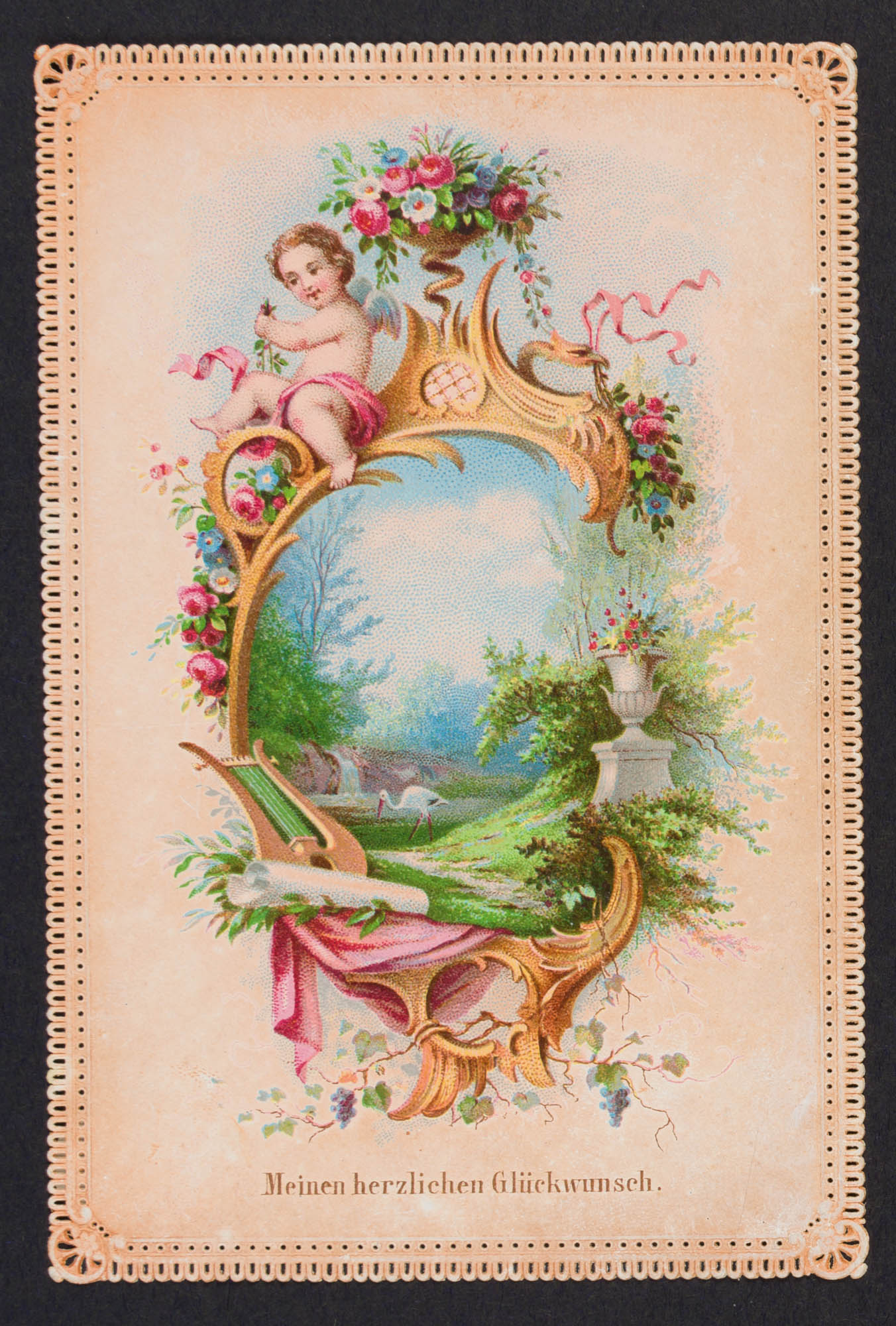 - Beschreibung: Der gerahmte Ausblick ist dekoriert mit Blumen, einem Engel, einer Lyra und roten Tüchern.