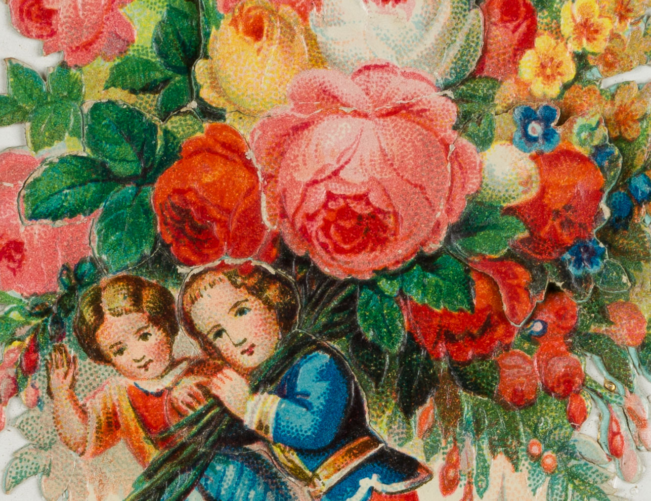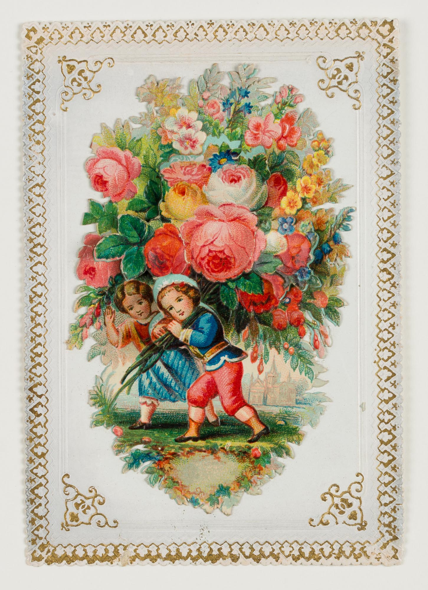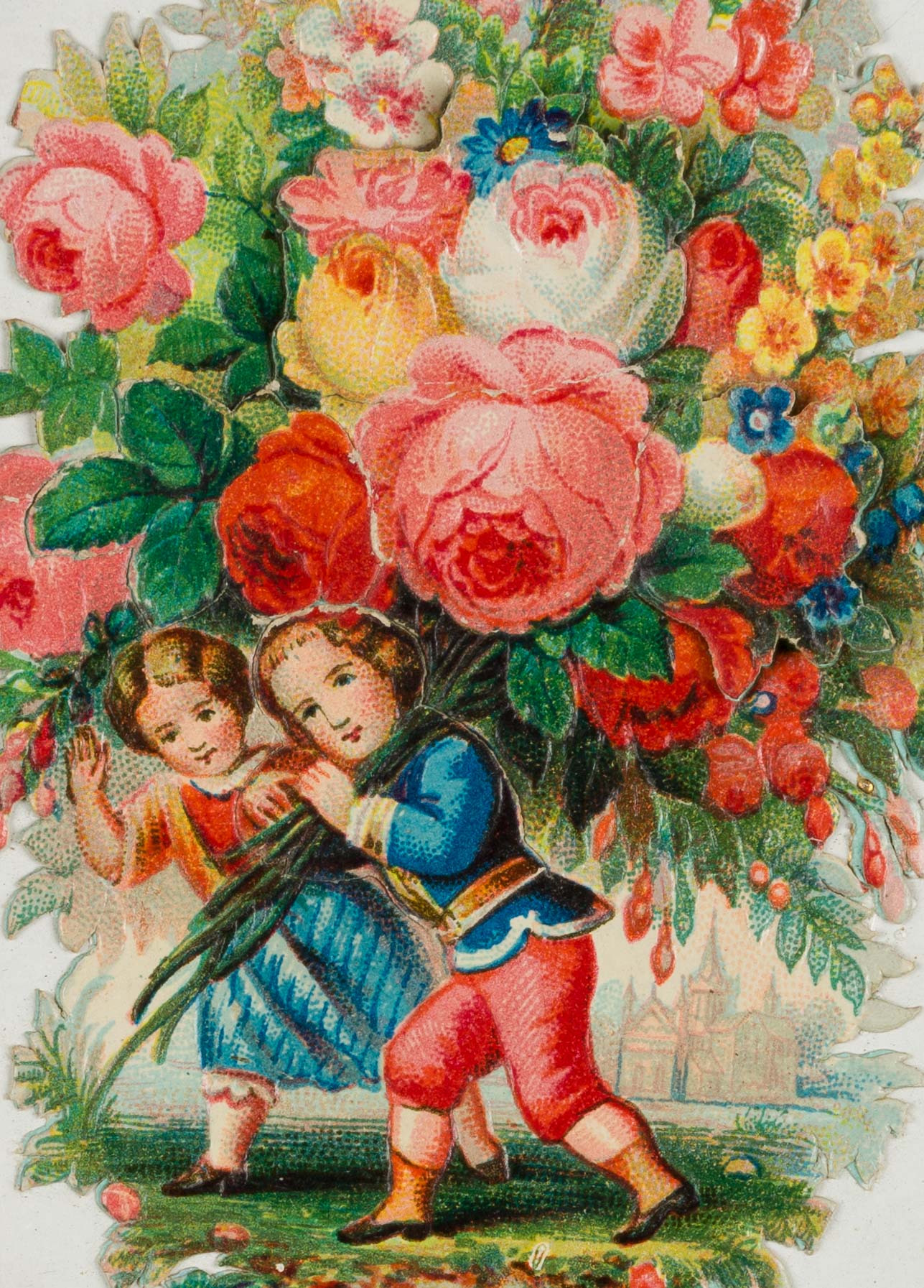 Unknown (19th century), Greeting card With children under a magnificent bouquet of flowers, 19th century, Chromolithograph