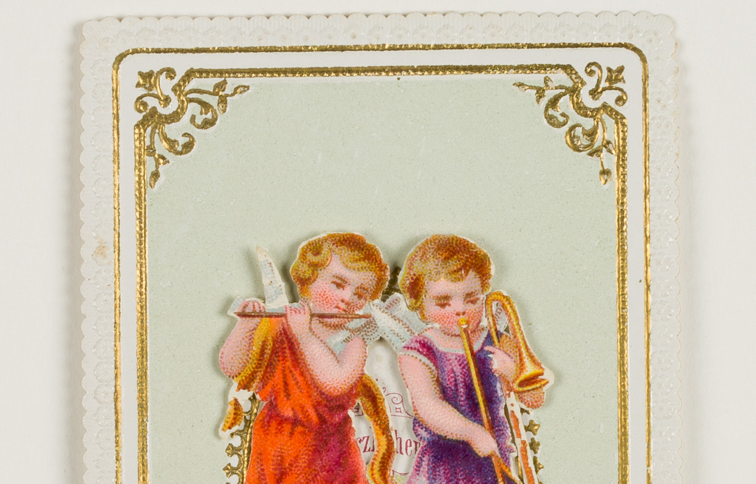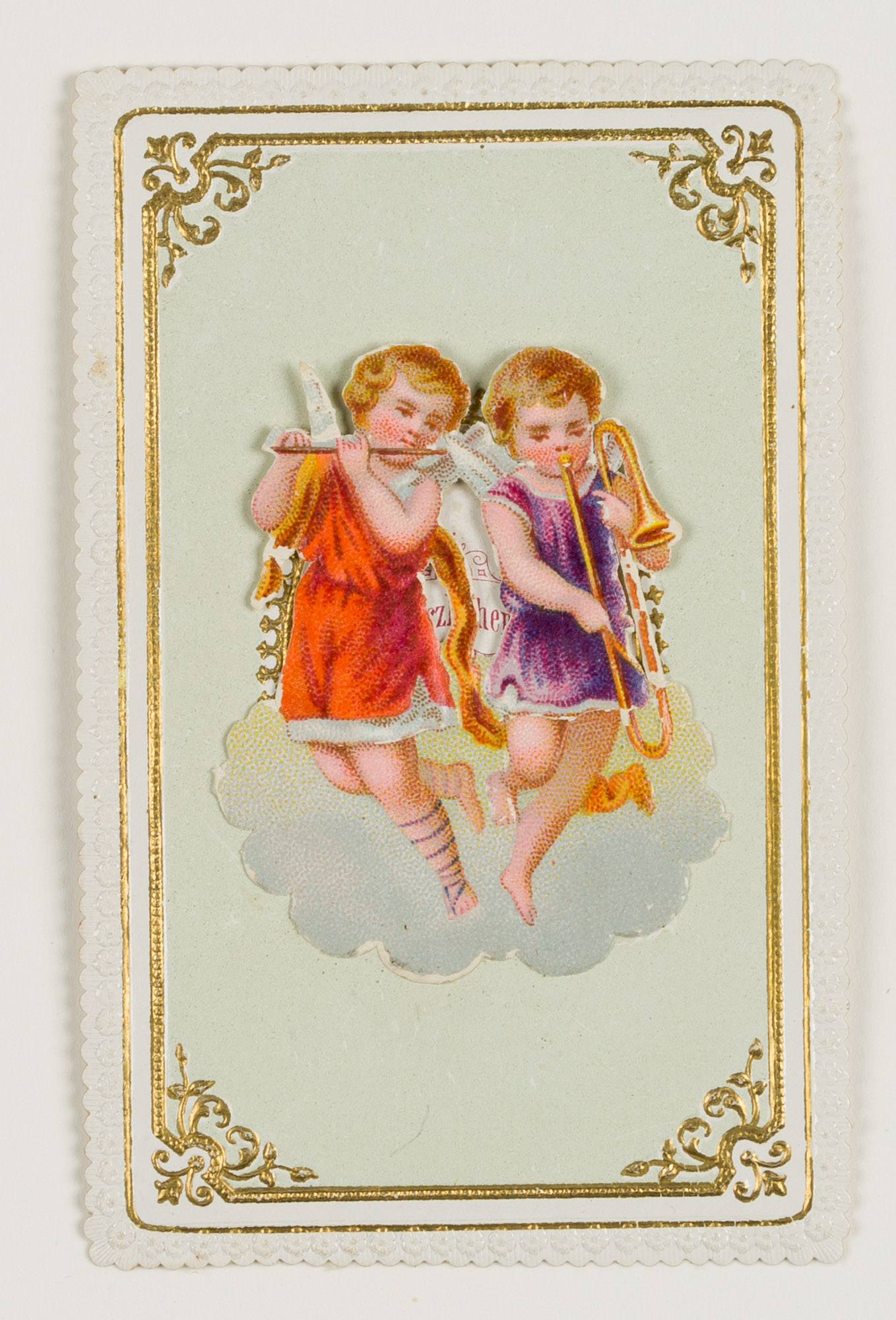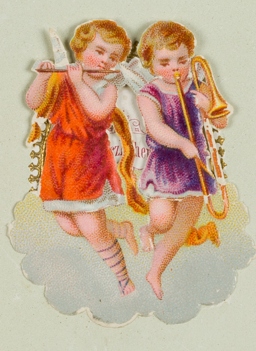Unbekannt (19. Jahrhundert), Glückwunschkarte mit musizierenden Engeln. Zum Aufklappen, um 1900, Glückwunschbillet