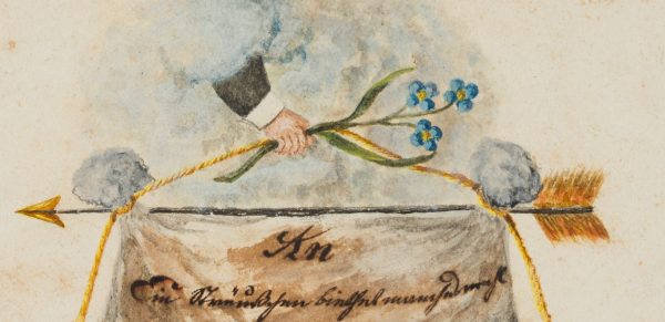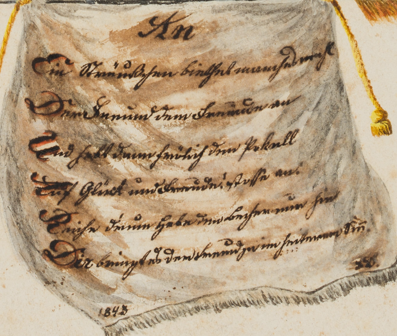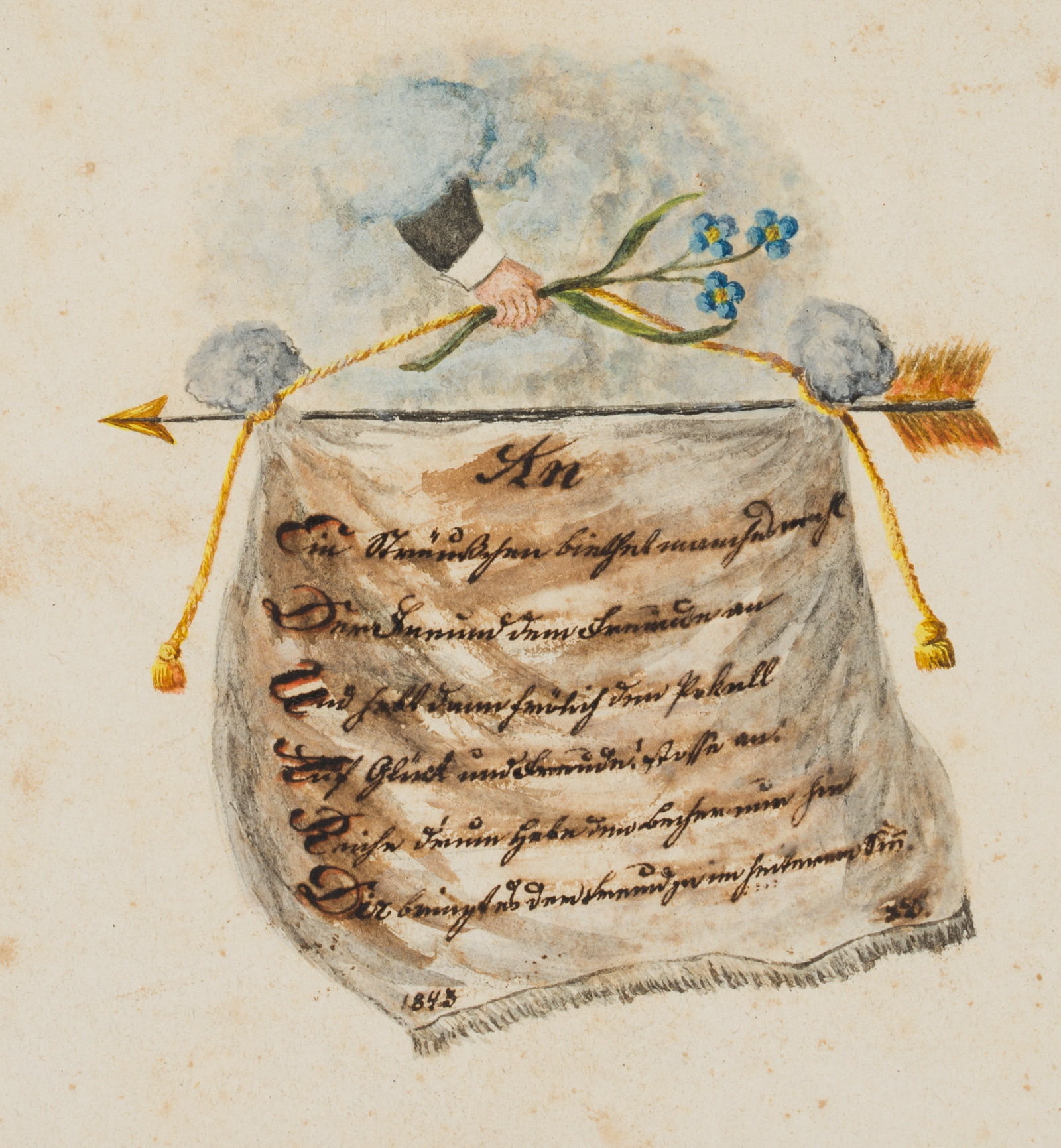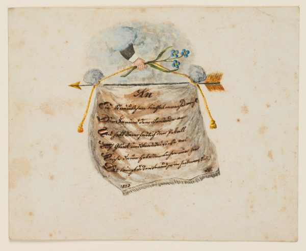 - Beschreibung: Sehr feine Handzeichnung, auf die an einen Pfeil befestigte Stoffbahn hat der Künstler bedacht seine handschriftlichen Glückwünsche gesetzt und unten links datiert: “1845”.