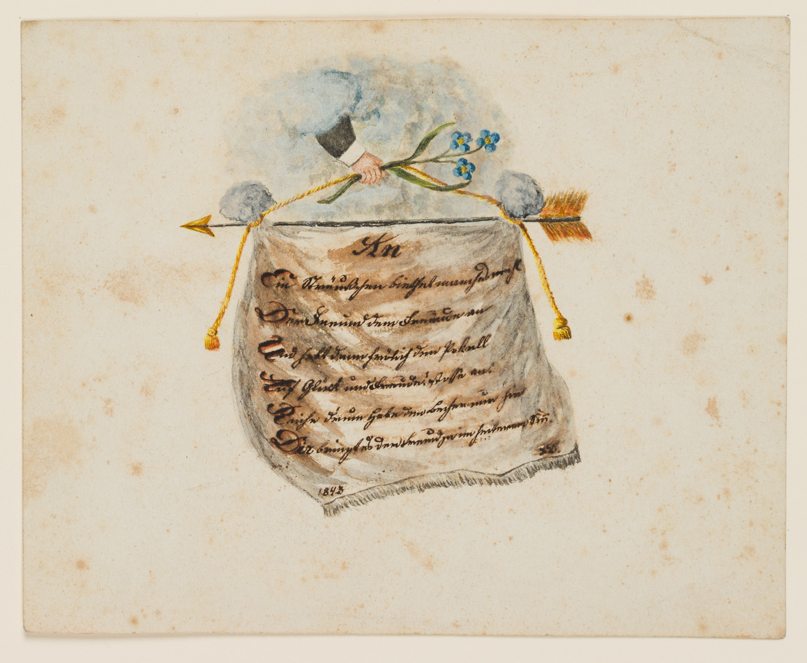 Unbekannt (19. Jahrhundert), Glückwunschkarte mit Pfeil und Vergissmeinnicht, 1843, 1843, Aquarell