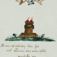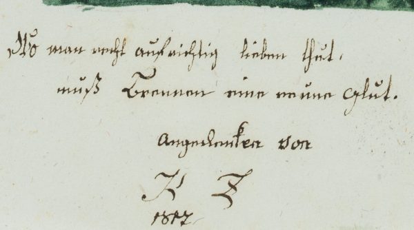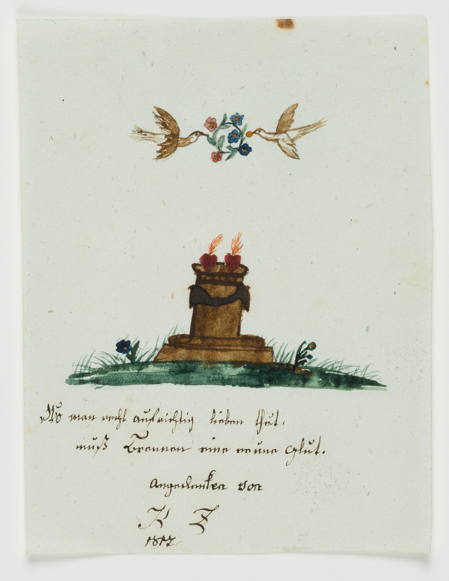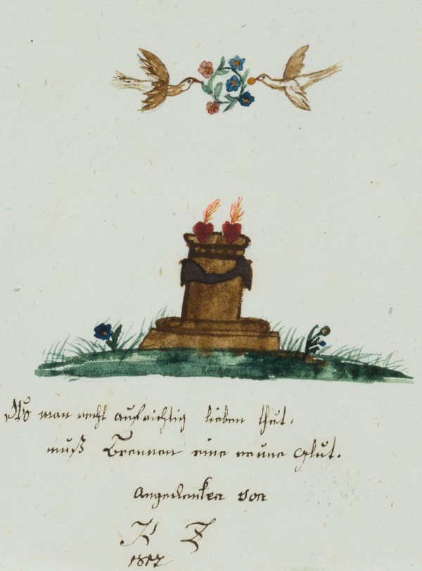 - Beschreibung: Unter der Darstellung handschriftlich bezeichnet und datiert, mit Monogramm: “Wo man nicht aufrichtig lieben tut..K. Z. 1817”.